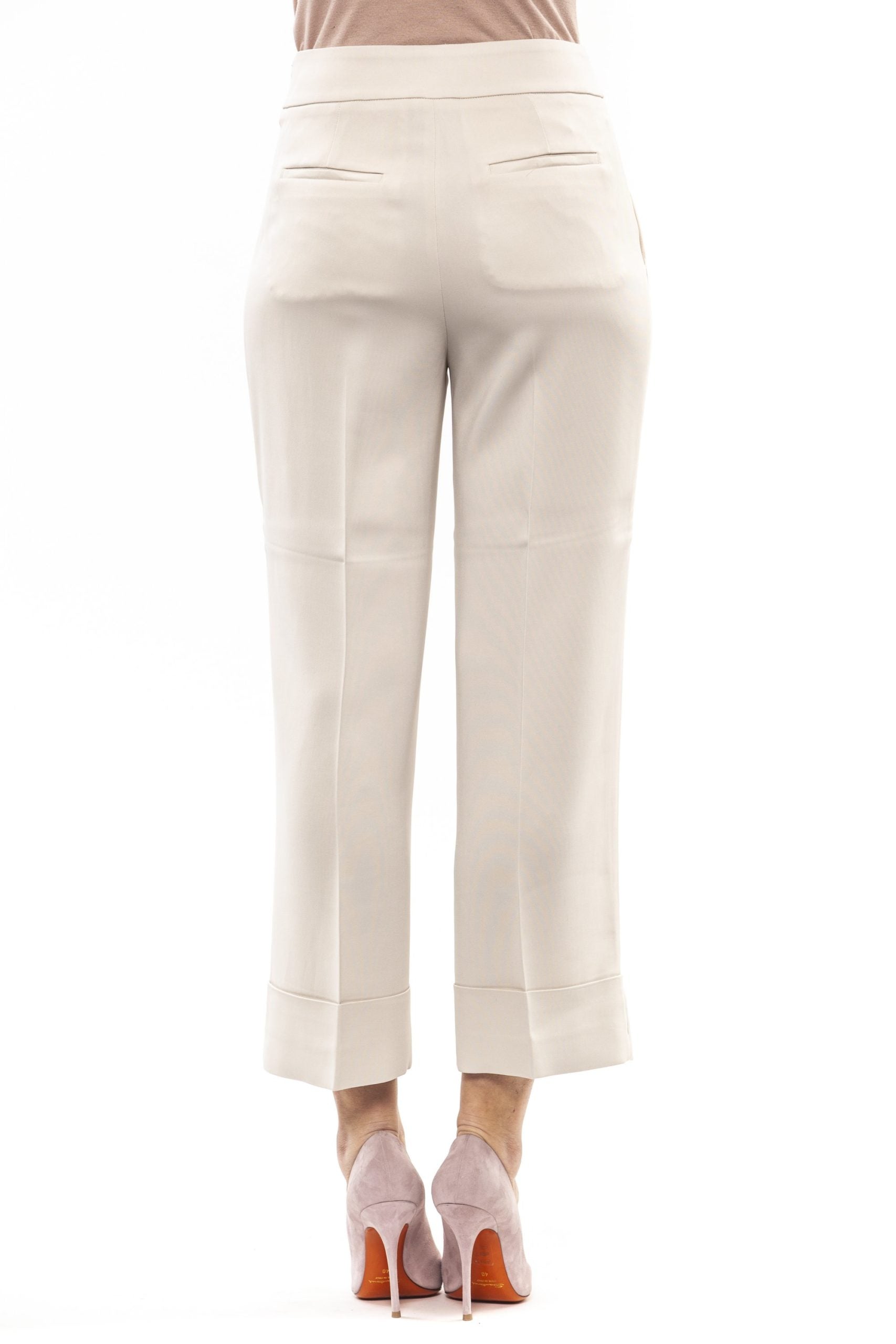 Weiche Hose. Zwei Taschen auf der Vorderseite und zwei Fadentaschen auf der Rückseite. Verschluss mit seitlichem Reißverschluss. Hohe Taille. Weite Passform mit Palazzo-Bein unten aufgeschlagen.