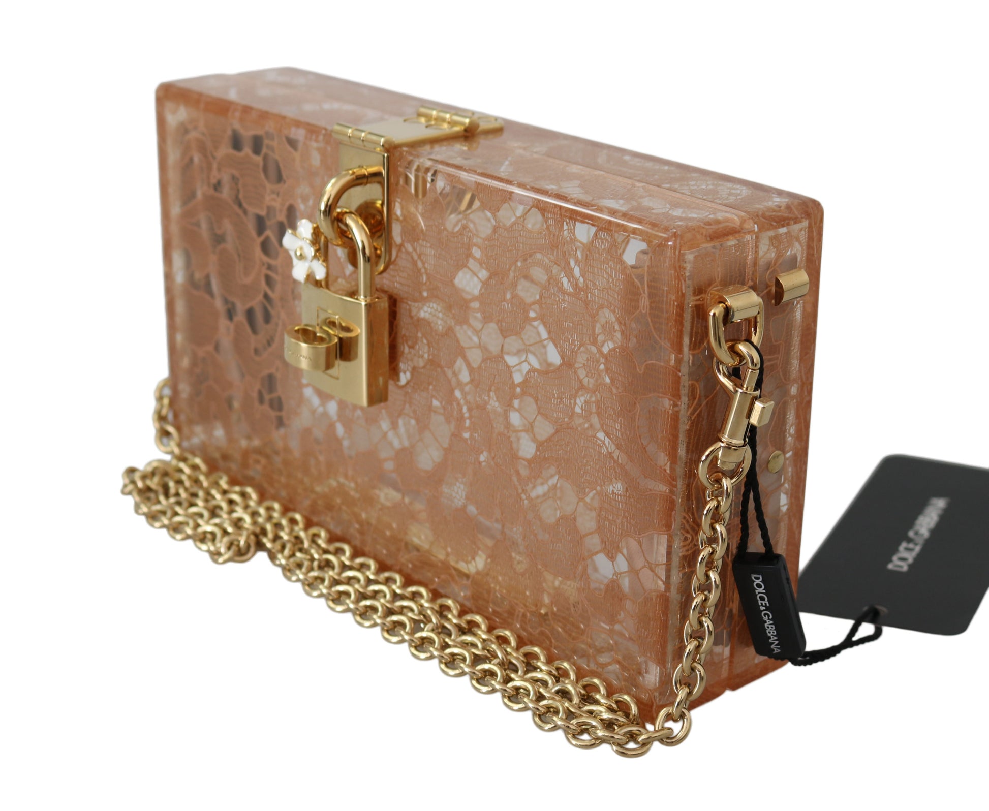 Wunderschöne, brandneue, 100% authentische Dolce & Gabbana Tasche mit durchsichtigem Karton, dekorativem Verschluss mit geprägtem Logo, abnehmbarem Kettenschulterriemen, goldfarbener Metallbeschläge und lederbezogenem Innenraum mit 1 Fach.