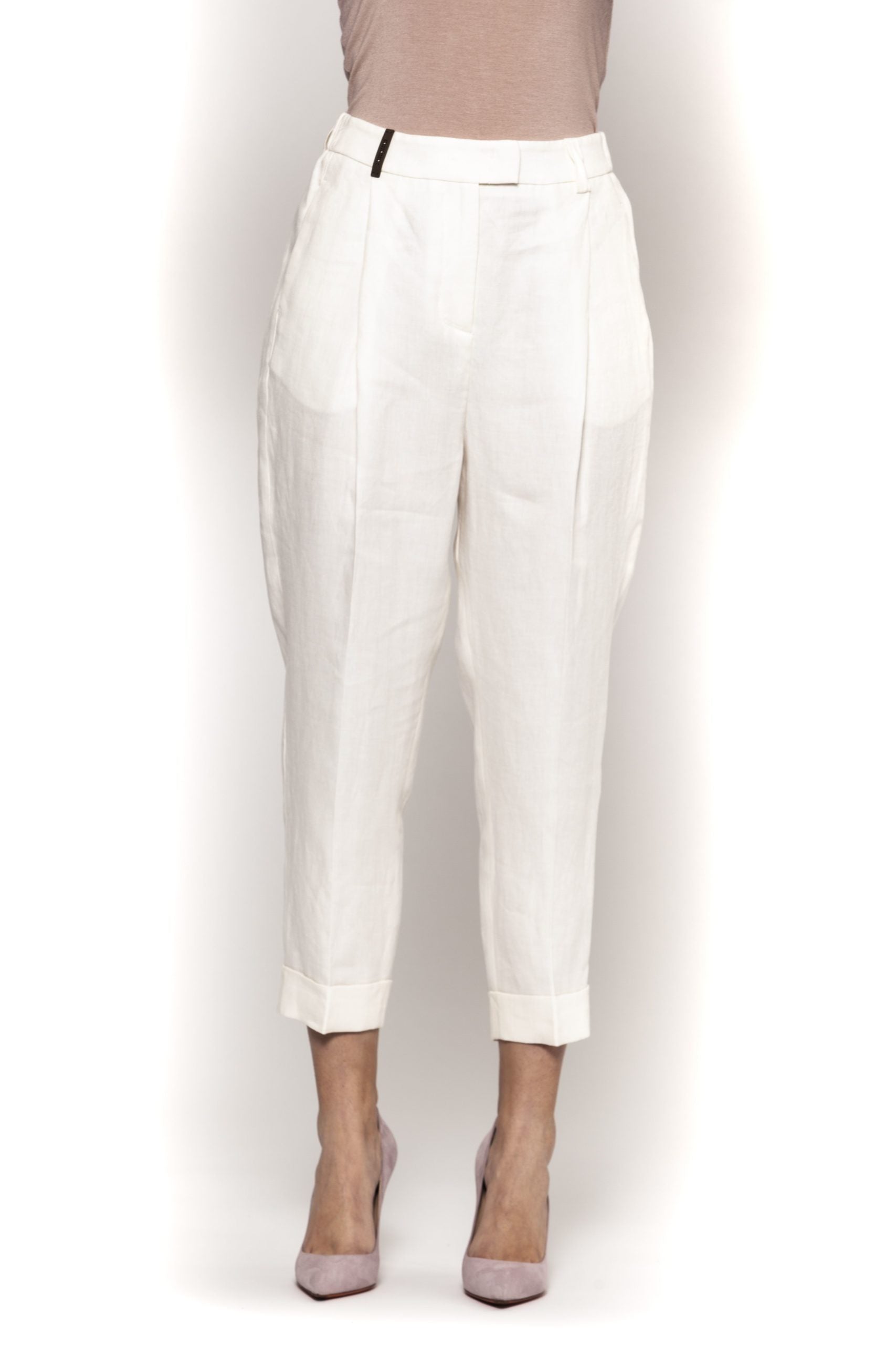 Frische Leinenhosen. Hohe Taille. Am Knöchel hochgekrempelt. Elastisches Band auf der Rückseite. Normale Passform.