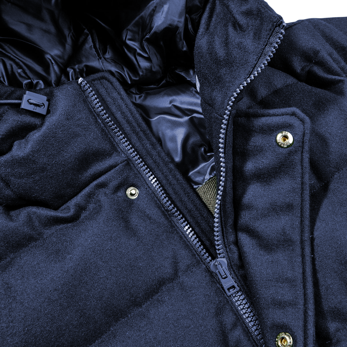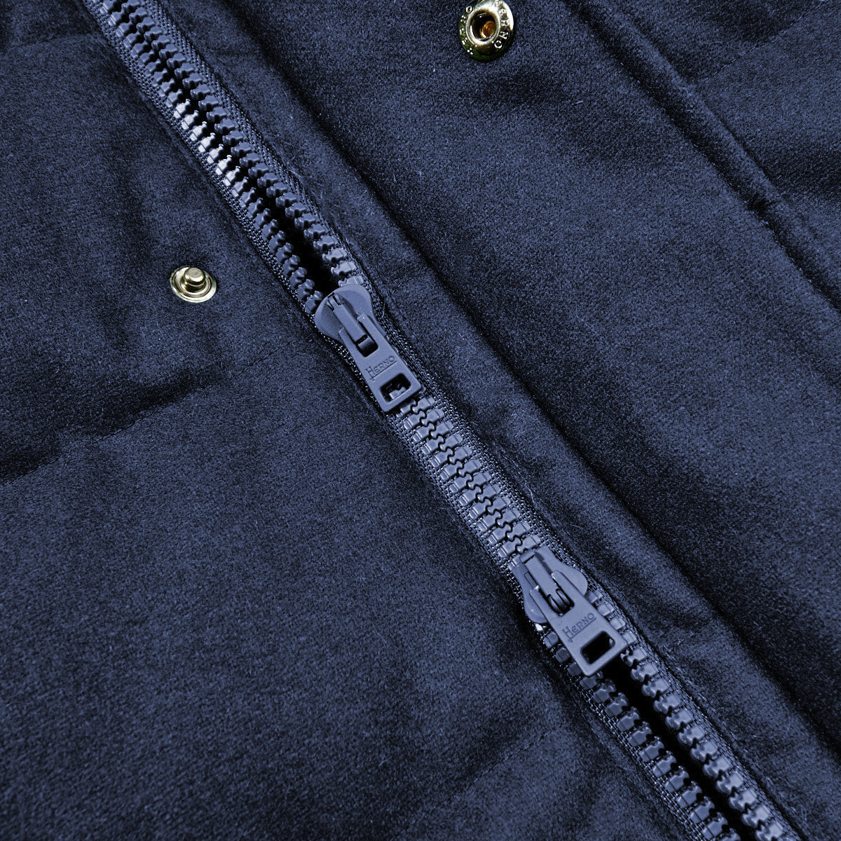 Blaue, leichte und wasserabweisende Daunenjacke aus Wollgemisch von Herno mit fester Kapuze und Kordelzug, unsichtbarem Verschluss mit Doppelschieber-Reißverschluss und Druckknöpfen, Reißverschlusstaschen, zwei Innentaschen mit Reißverschluss und blauen Rippenbündchen. Herno Polar-Tech Kollektion.