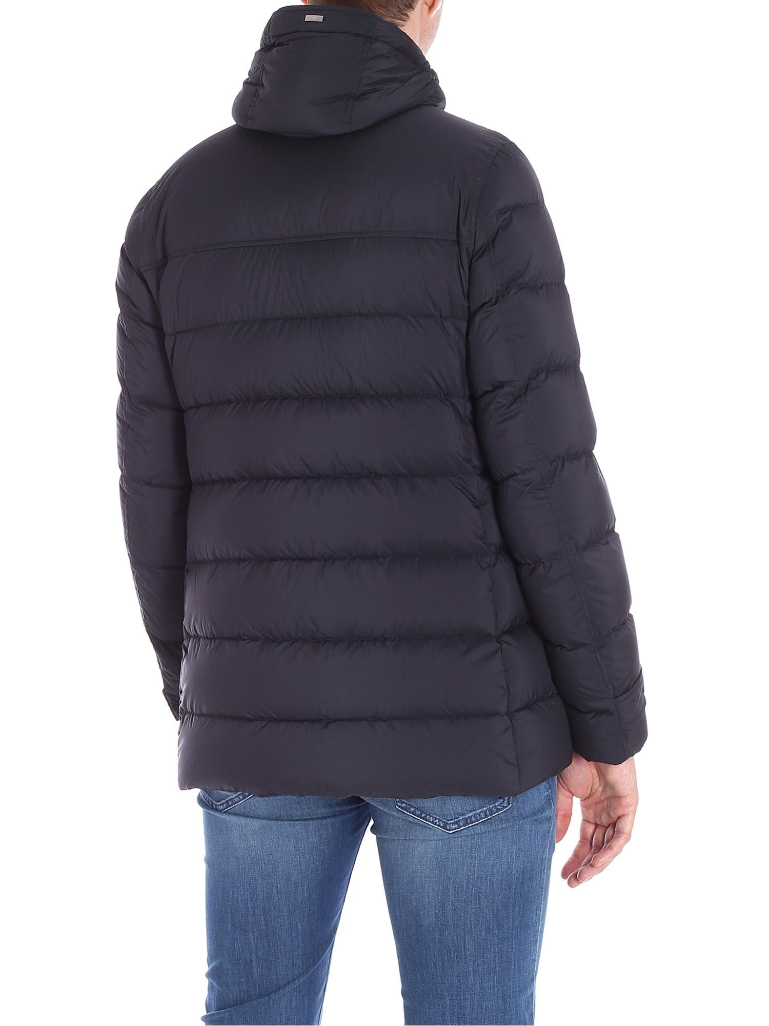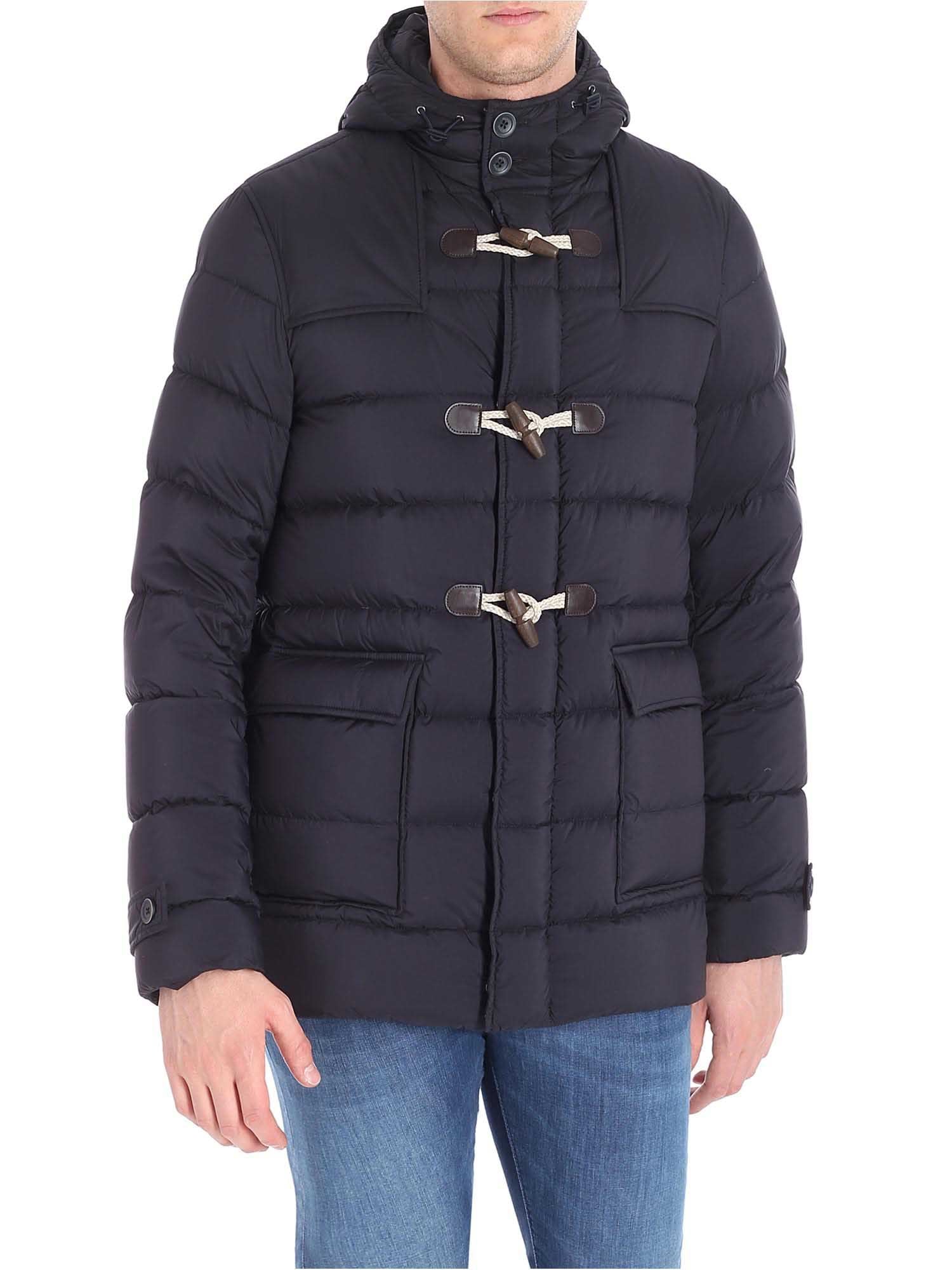 Gesteppte Daunenjacke "Montgomery" mit Kapuze aus der Legend-Kollektion von Herno. Die Frösche auf der Vorderseite sind mit braunen Lederdetails verziert.