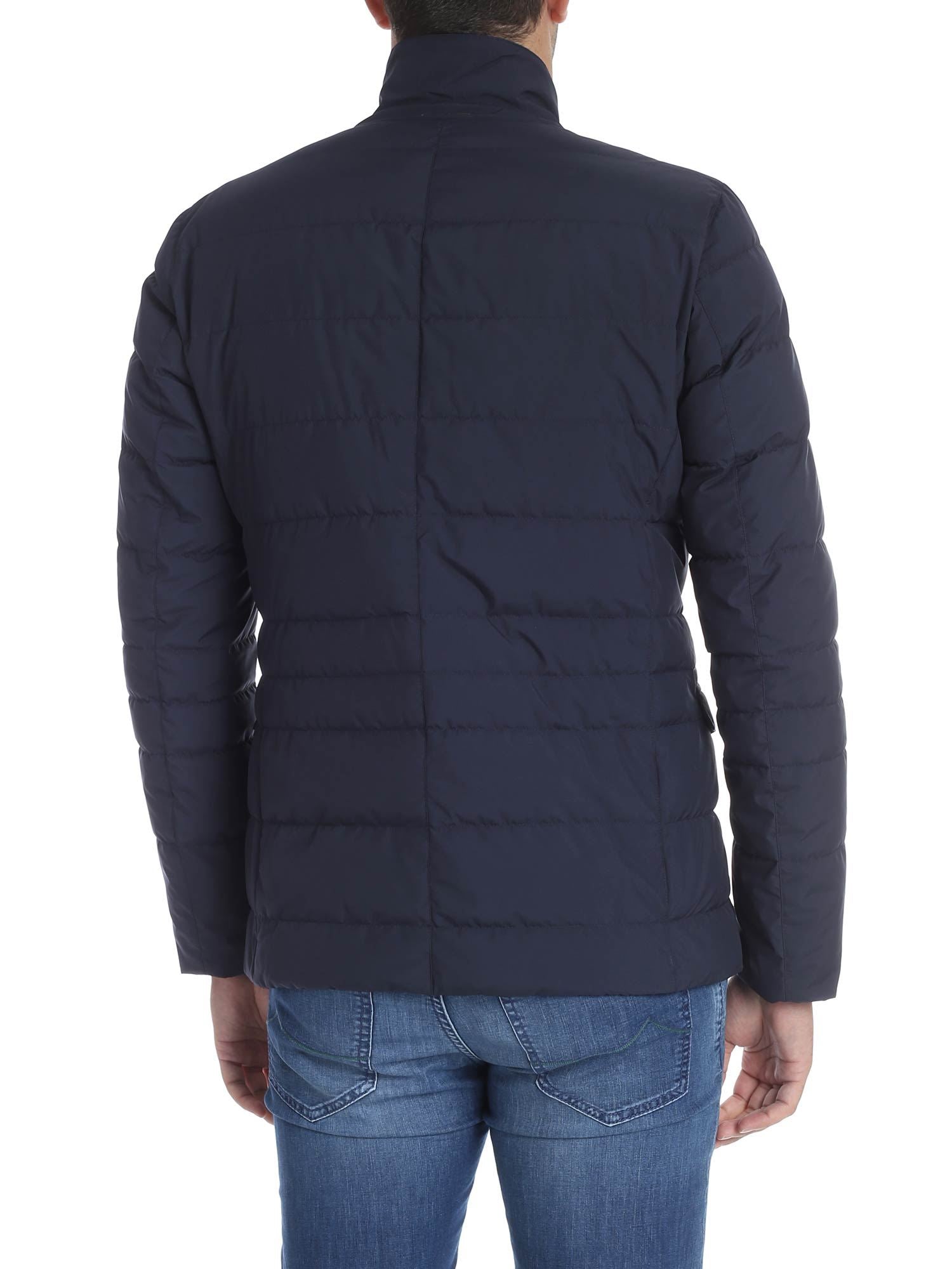 Herno blaue gesteppte Polyester Daunenjacke Windstopper, Seitentaschen mit Magnetverschluss, Schlitztasche auf der Brust und Innentaschen mit Reißverschluss. Doppelter Schiebe-Reißverschluss, Knöpfe und Magnet.