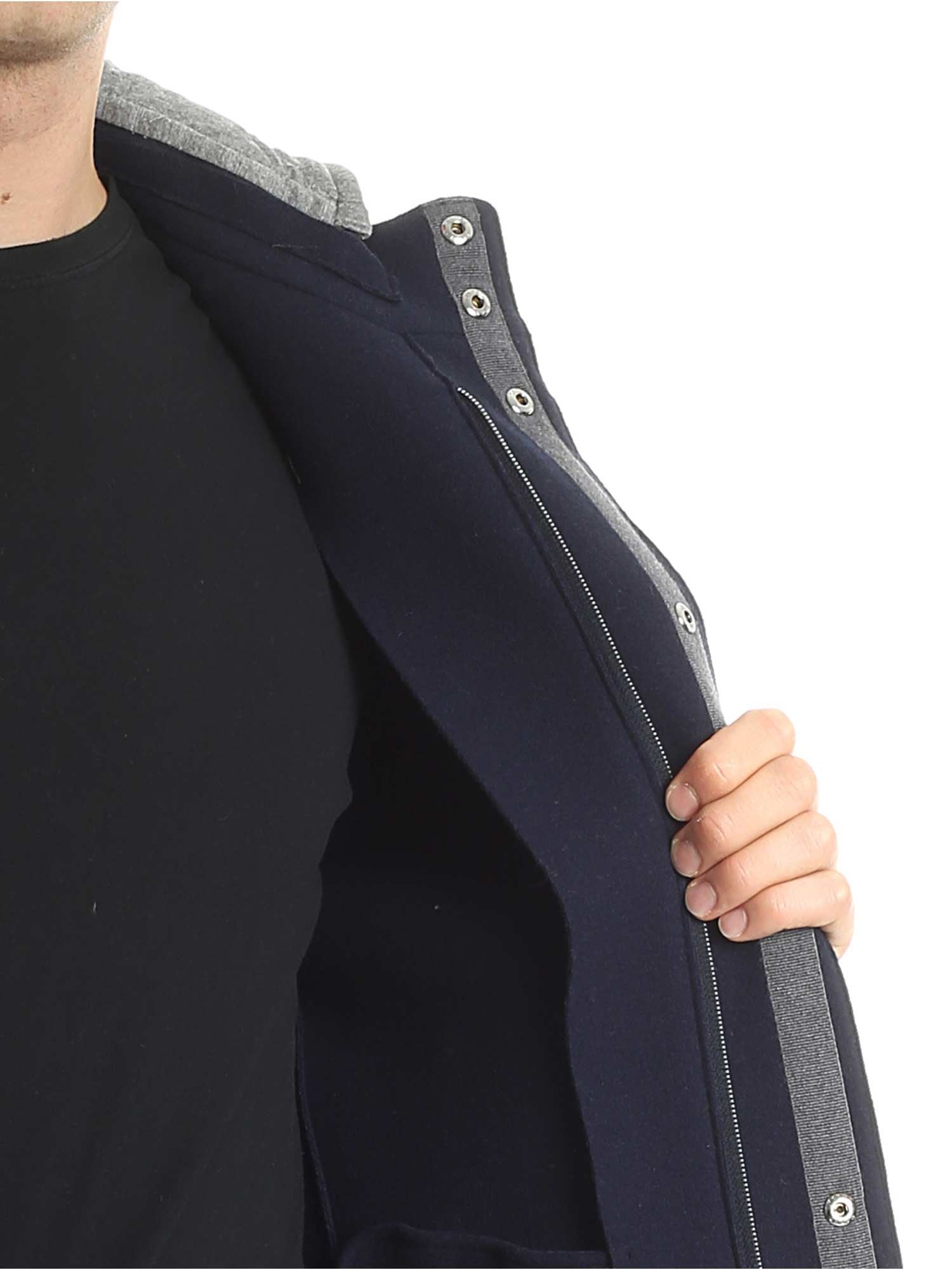 Blauer Mantel von Herno aus der Resort-Kollektion, seitliche Eingrifftaschen, abnehmbare gepolsterte Kapuze. Reißverschluss und Druckknöpfe. Hergestellt in Italien