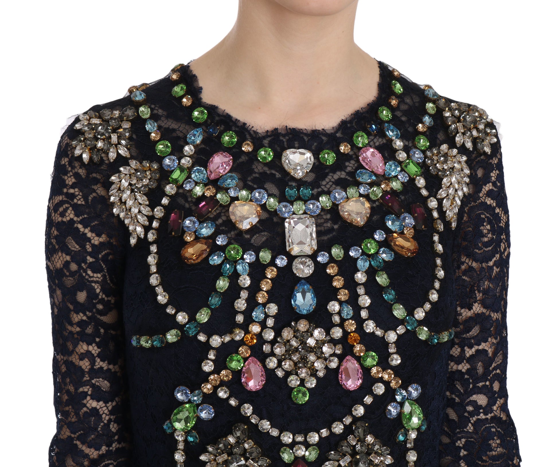 Blaues Kleid aus geblümter Spitze mit Kristall