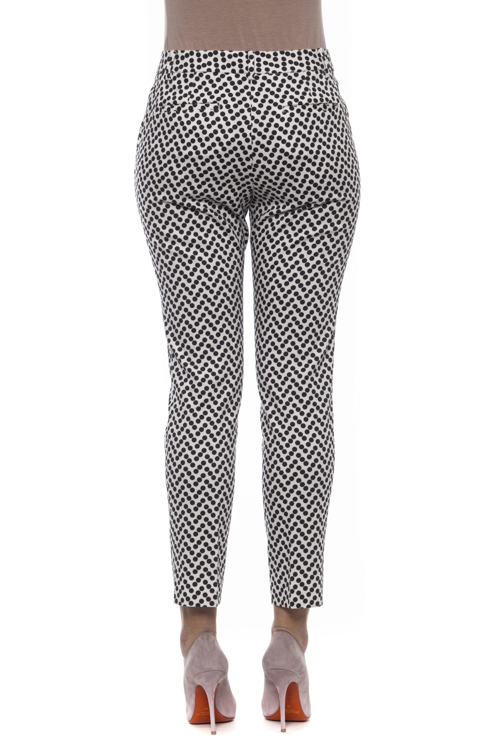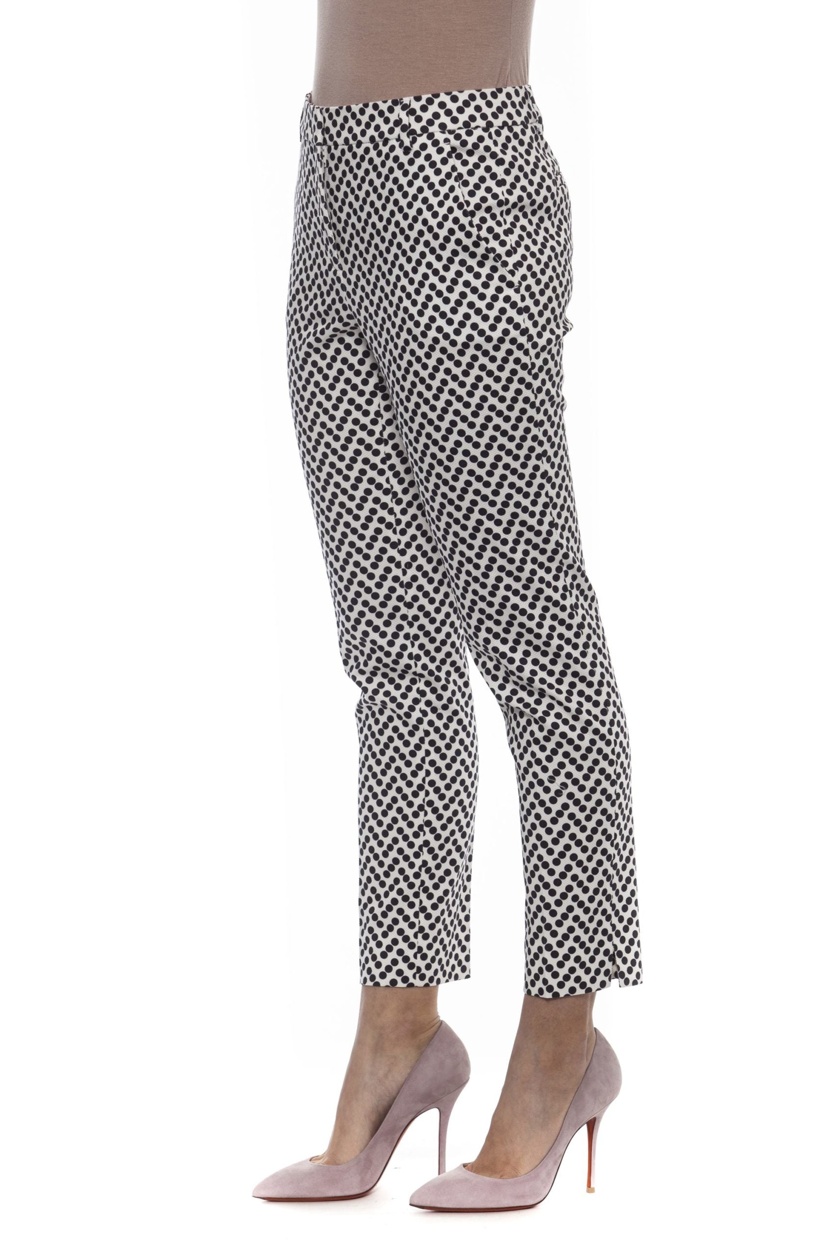 Klassische Stretch-Hose mit Druck. Zwei Taschen auf der Vorderseite. Zwei Fadentaschen auf der Rückseite. Normale Taille. Kleine Schlitze an der Unterseite. Verschluss mit Häkchen und verstecktem Reißverschluss. Schmale Passform.