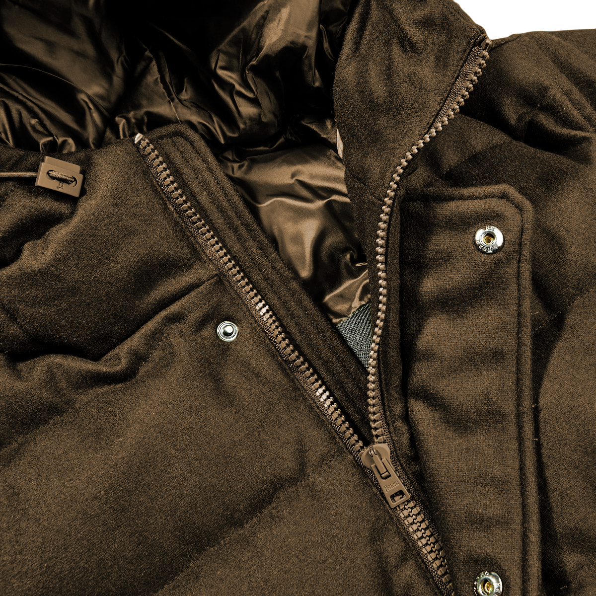 Braune, leichte und wasserabweisende Daunenjacke aus Wollgemisch von Herno mit fester Kapuze und Kordelzug, unsichtbarem Verschluss mit Doppelschieber-Reißverschluss und Druckknöpfen, Reißverschlusstaschen, zwei Innentaschen mit Reißverschluss und braunen Rippbündchen. Herno Polar-Tech Kollektion.