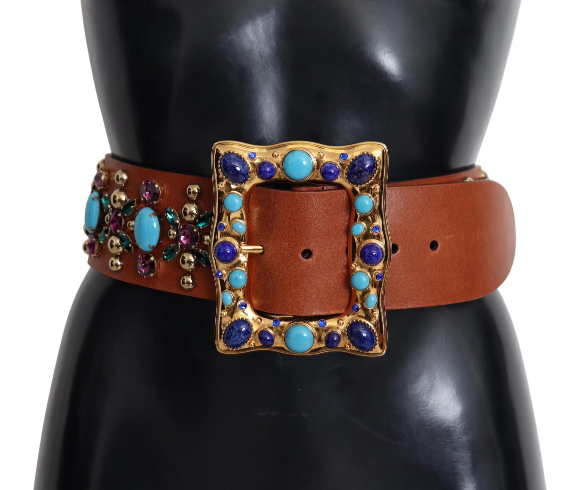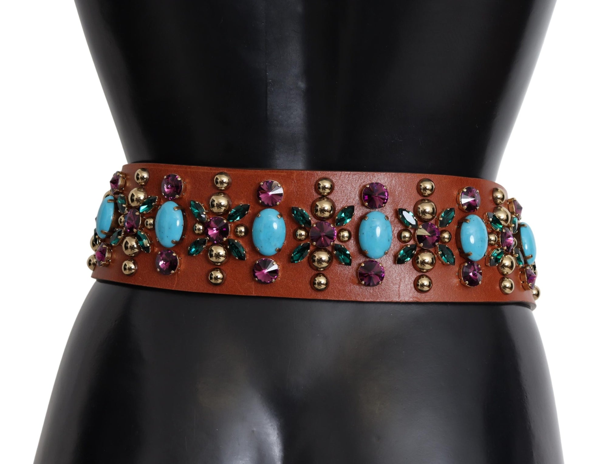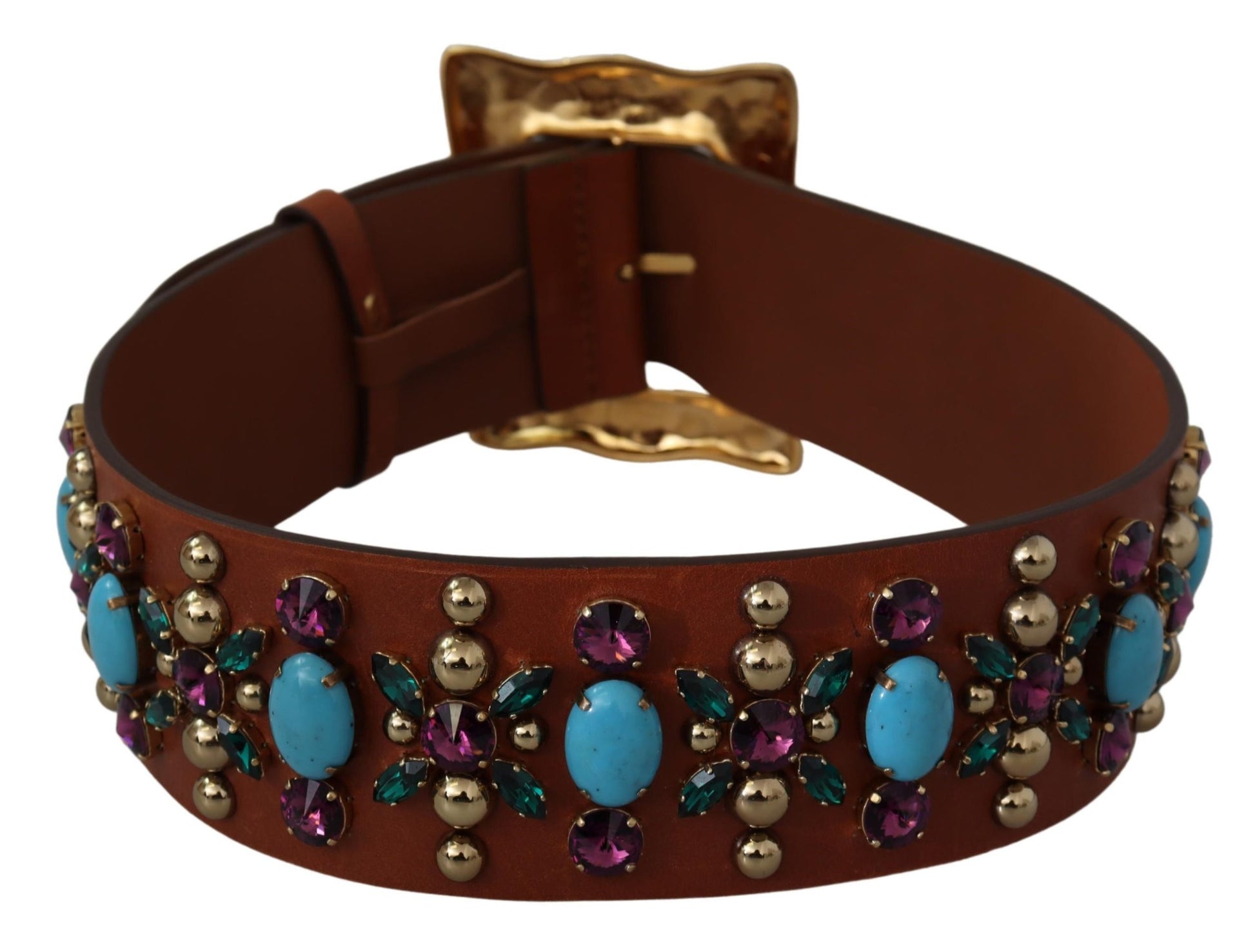 Wunderschöner, brandneuer und 100% authentischer breiter brauner Gürtel mit Nieten vonDolce & Gabbana . Eine Kombination aus vergoldetem Metall und strapazierfähigem Leder wurde verwendet, um ein flexibles Accessoire mit einer großen Schnalle zu schaffen.
