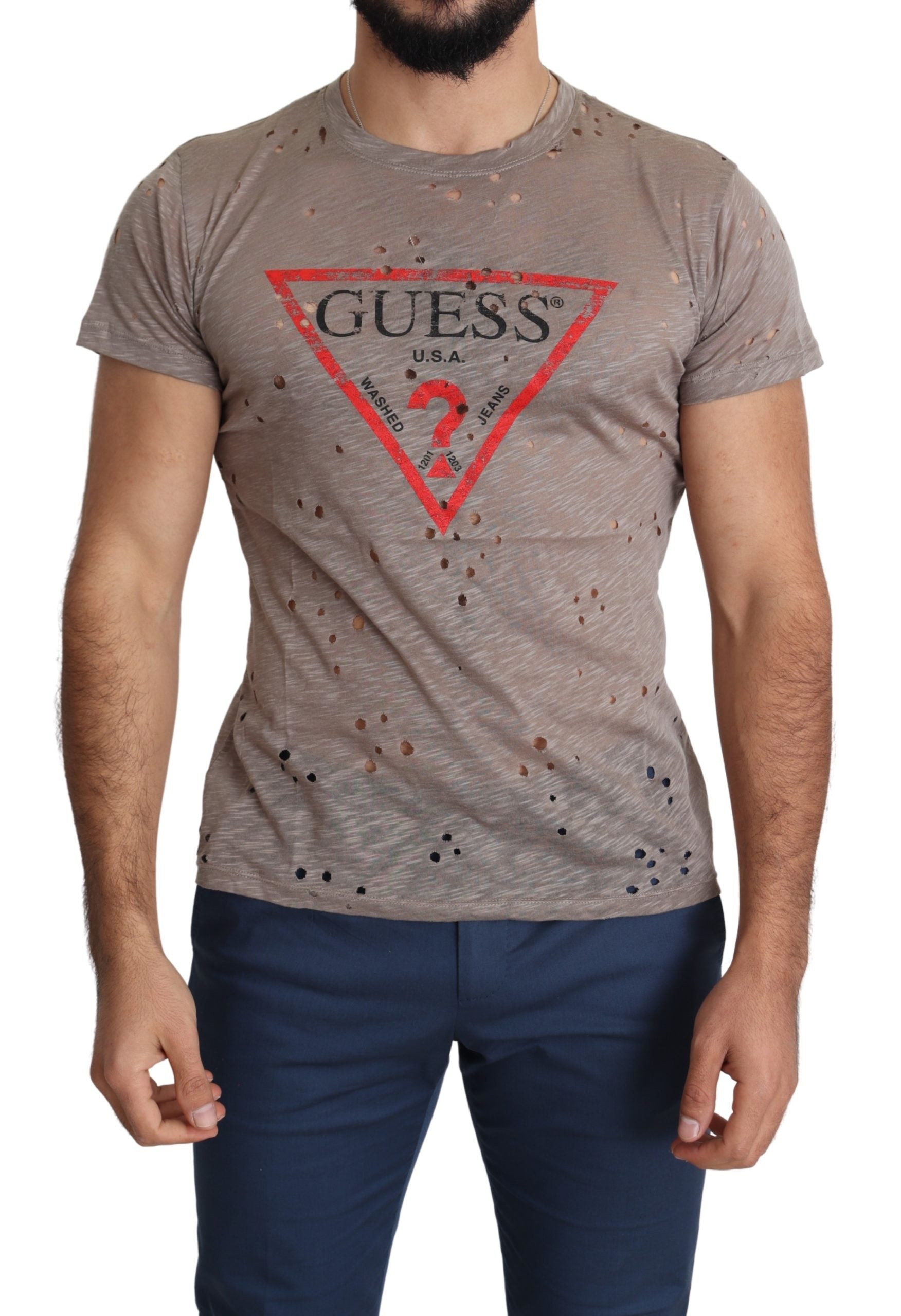 Braunes Baumwoll-Stretch-T-Shirt mit Logodruck für Männer Casual Perforated T-Shirt