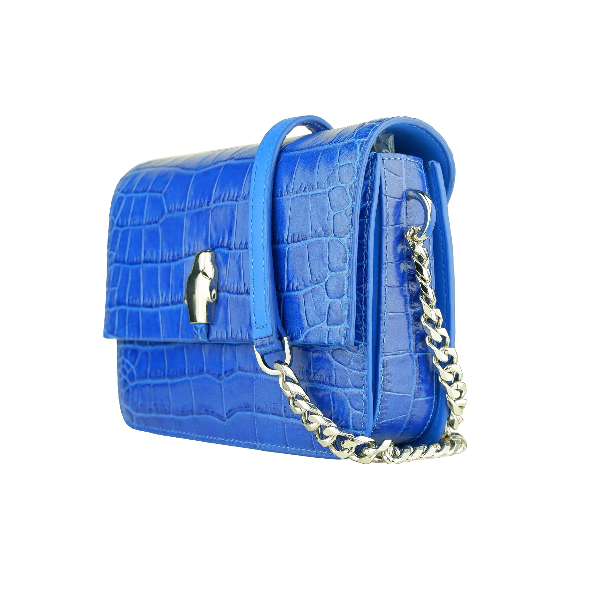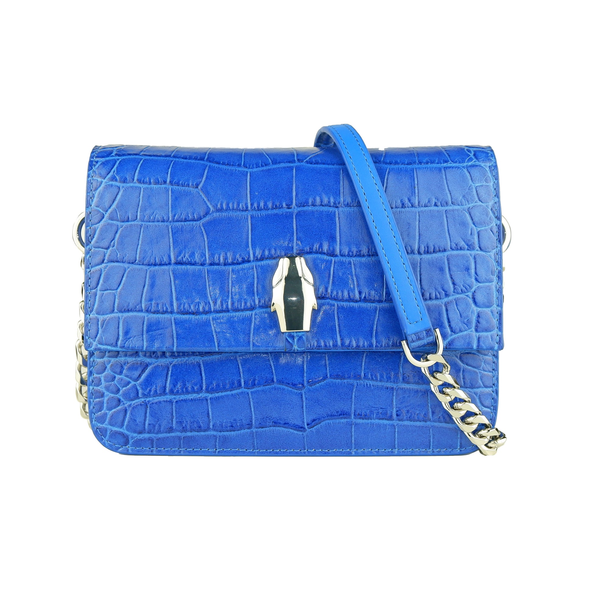 Cavalli Class Umhängetasche, blaue Schlangentextur, 3 Innenfächer, Magnetverschluss auf der Vorderseite, Maße 18,5 x 13,5 x 5, inklusive Staubbeutel.