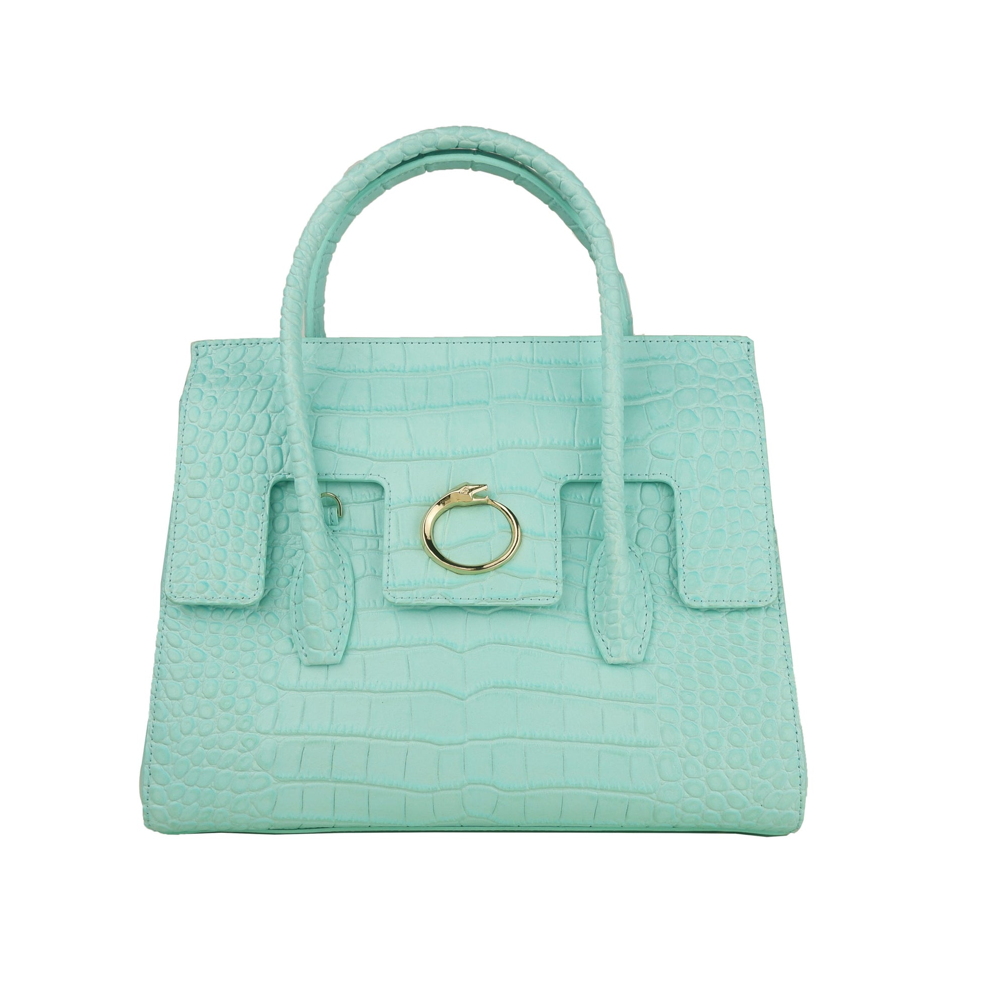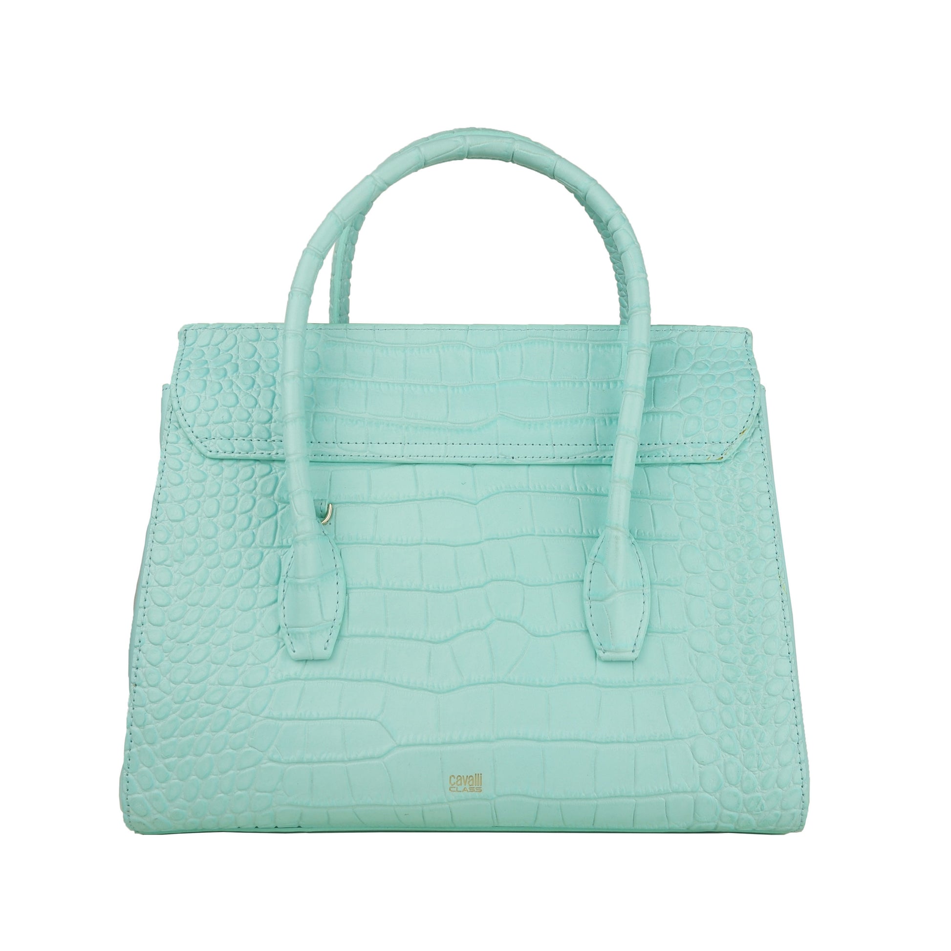 Cavalli Class Handtasche mit Schultergurt, türkisfarben, Piton-Struktur, Markenlogo auf der Vorderseite, Clipverschluss.
