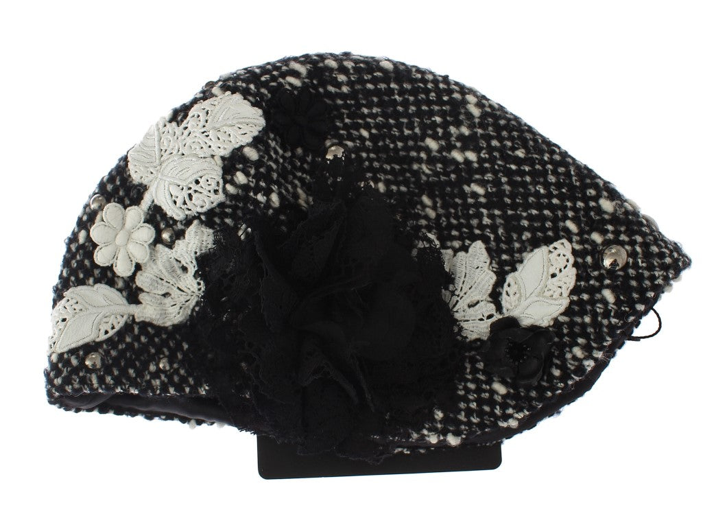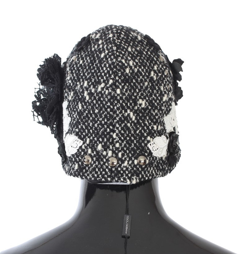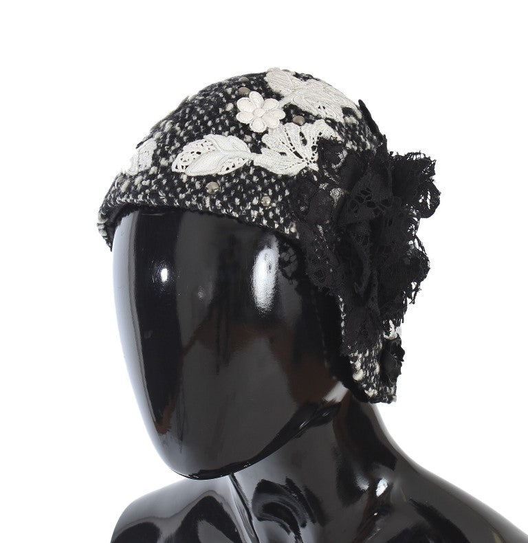 Cloche Hut aus grauer Wolle mit floraler Spitze und Nieten