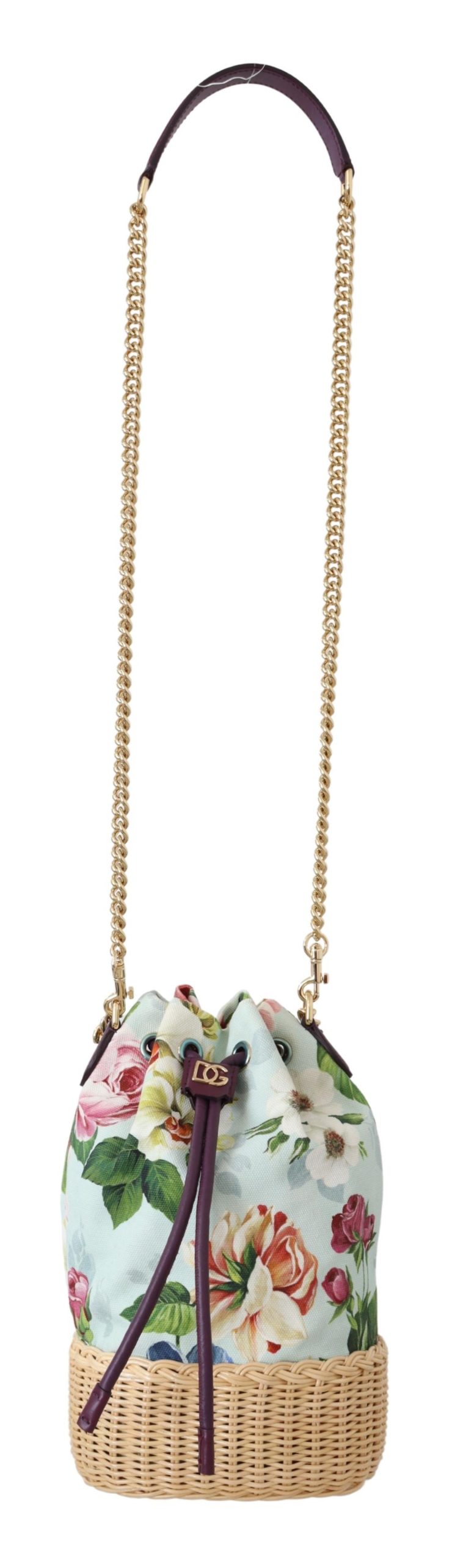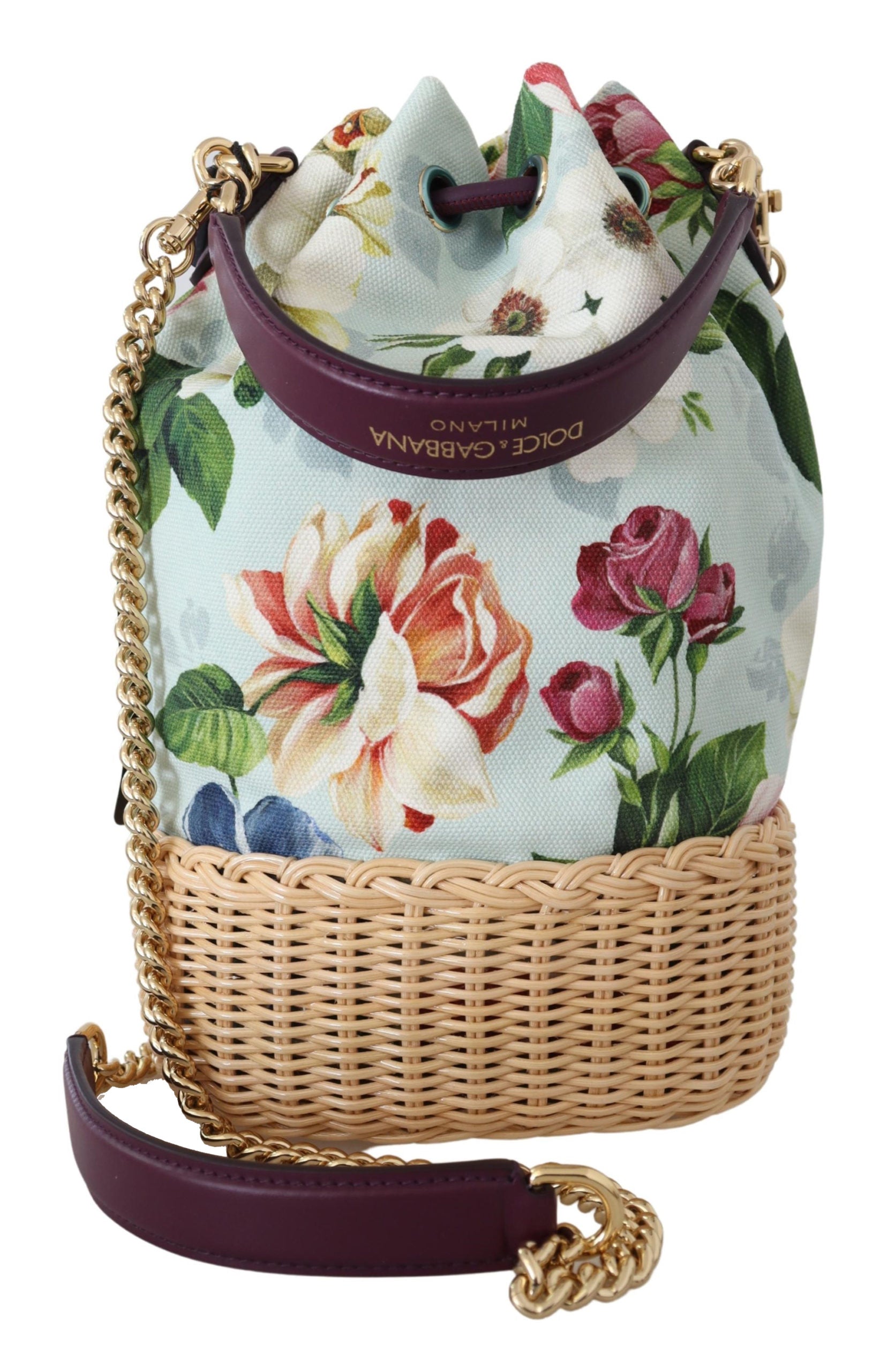 Wunderschöne, brandneue, 100% authentische Dolce & Gabbana 'Millennials' Umhängetaschemit Etiketten . Kordelzugverschluss aus Leder. Verziert mit einem Metall-Logo, einem bunten Blumenmuster und einem gewebten Element in Creme. Halbrunder Ledergriff. Abnehmbarer Schulterriemen aus goldfarbener Kette. Internes Hauptfach mit einem Steckfach und einem Kartenfach.