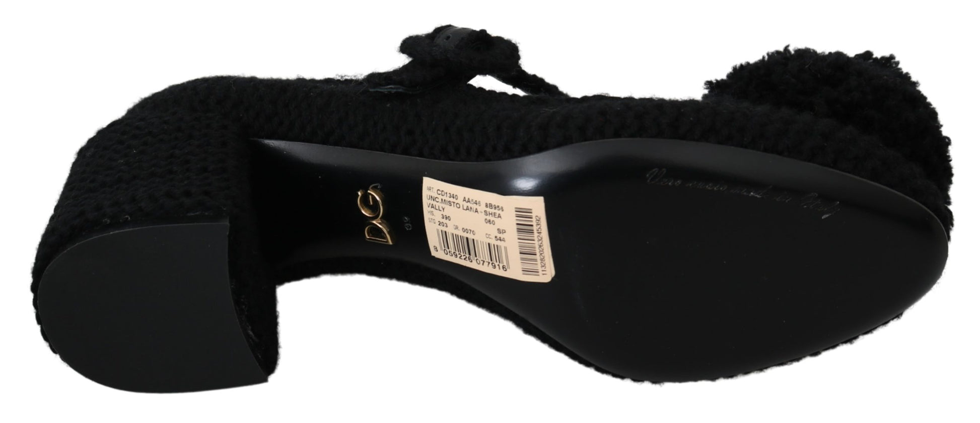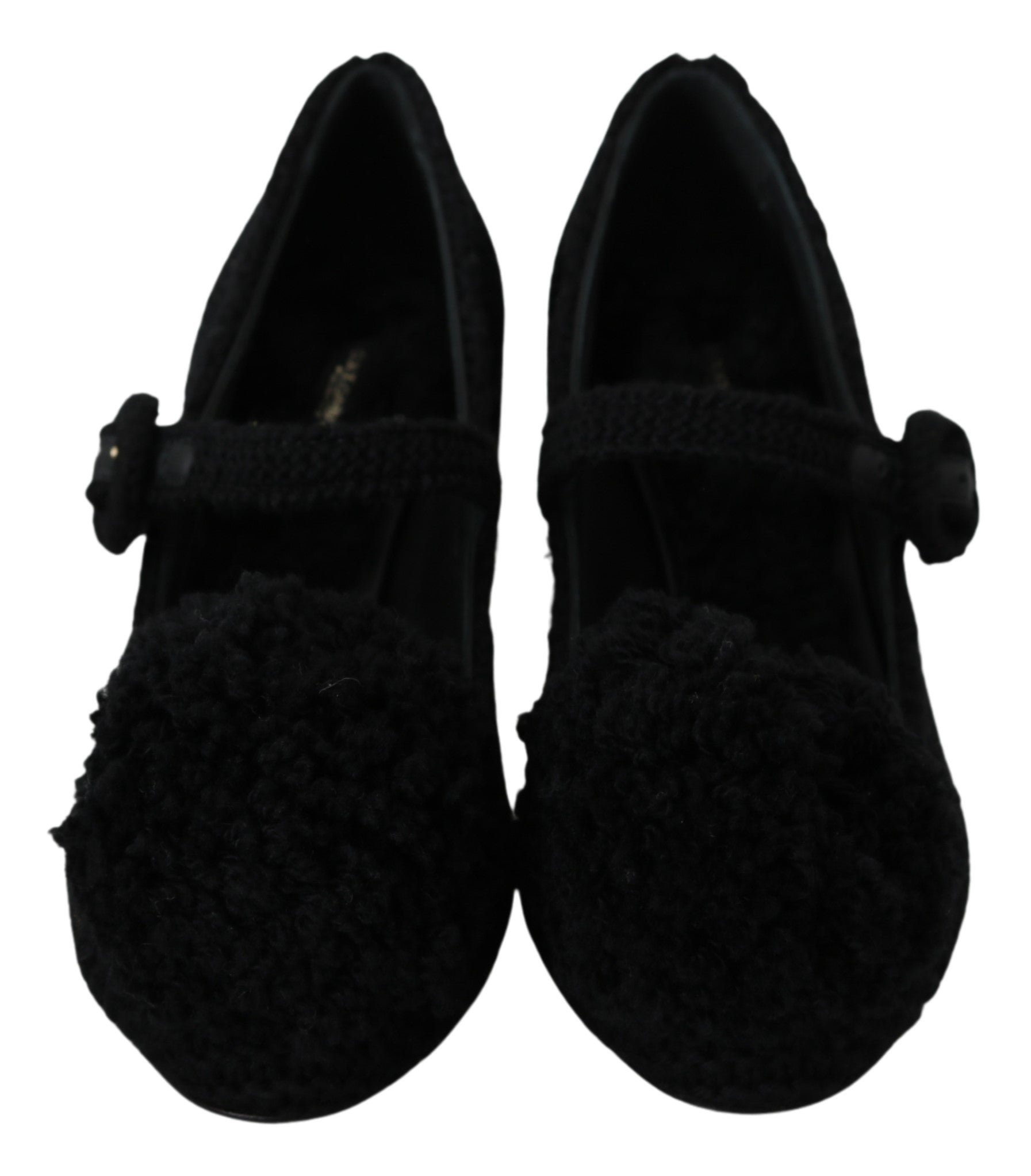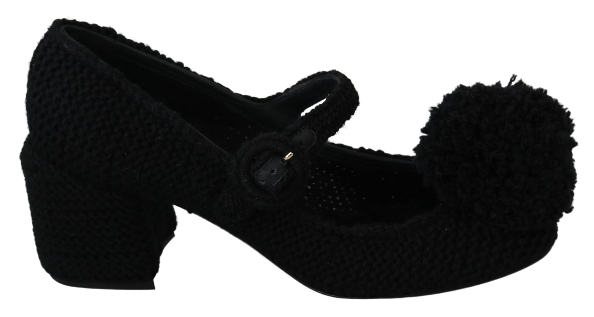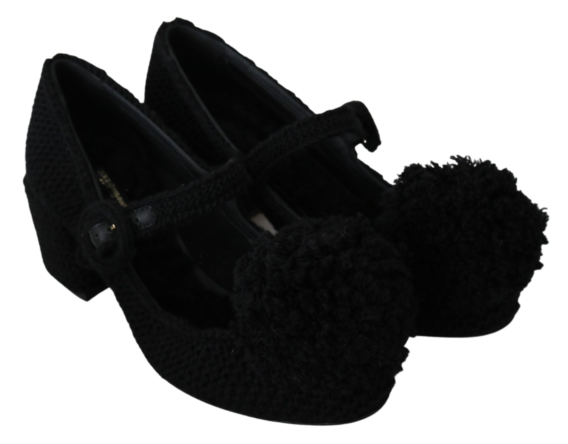 Schwarze Wolle Pom Pom Block Mary Jane Schuhe