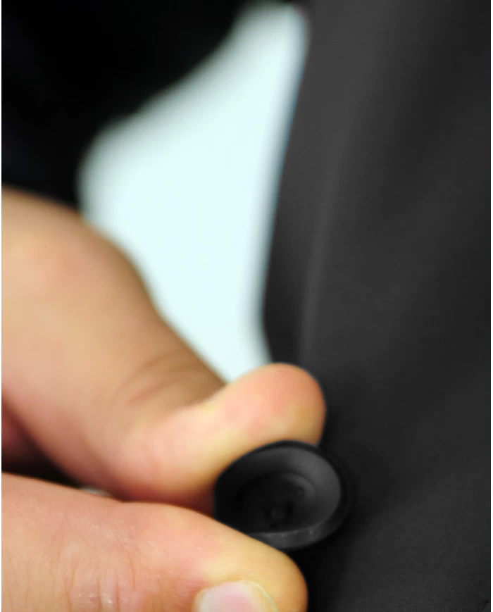 wasserdicht. Einreihig mit Knopfverschluss auf der Vorderseite, lange Ärmel mit Fröschen an den Manschetten.