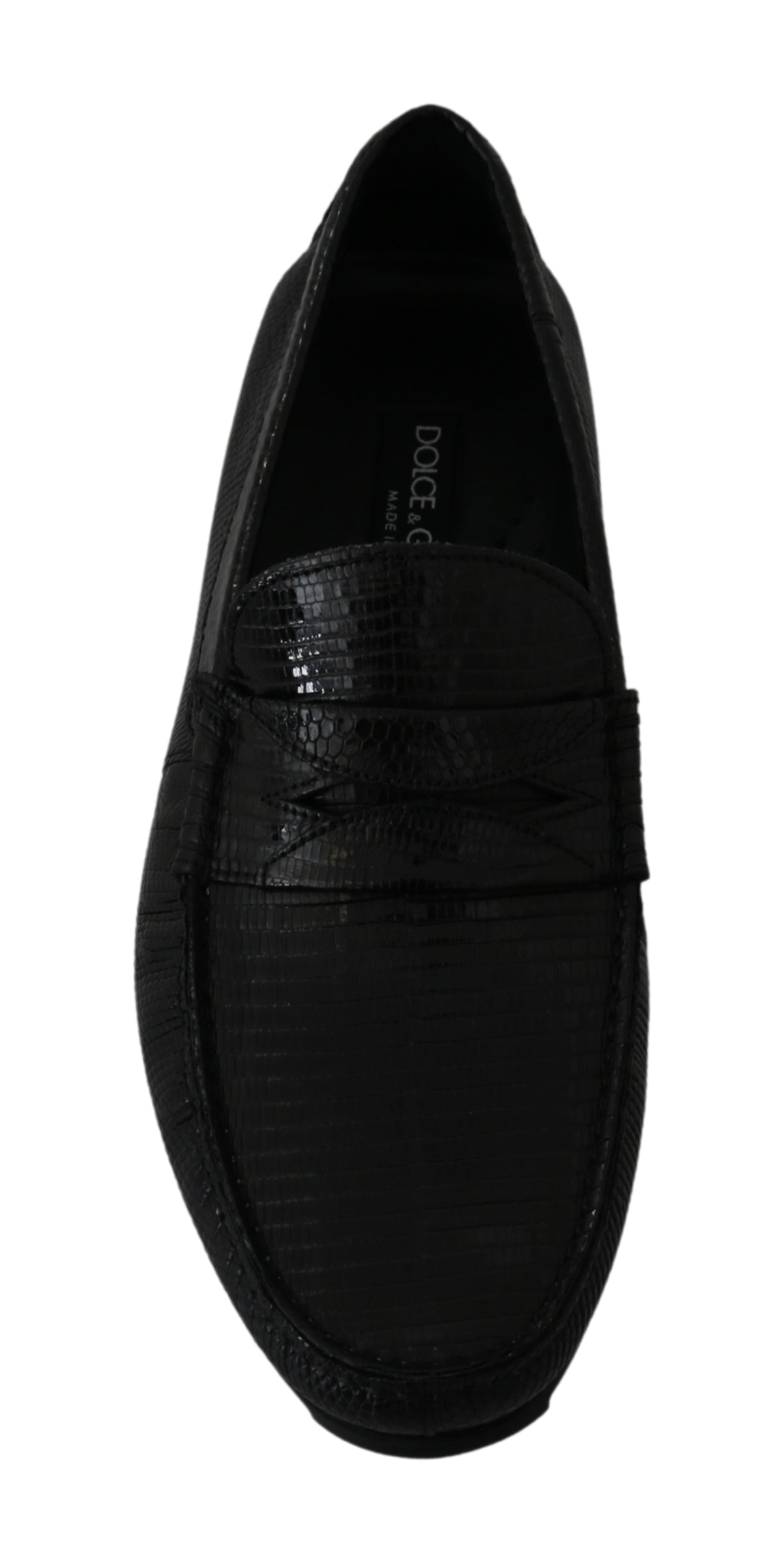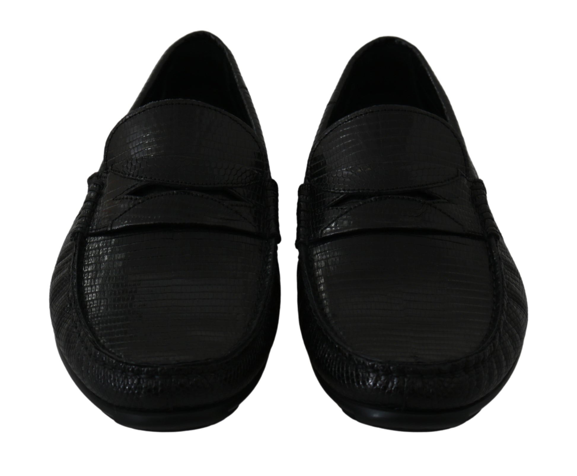 Schwarzes Eidechsenleder Flache Loafer Schuhe
