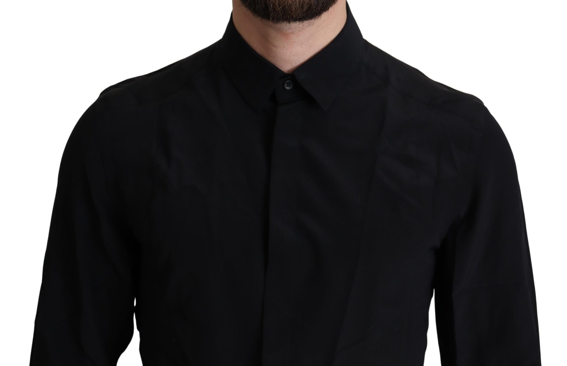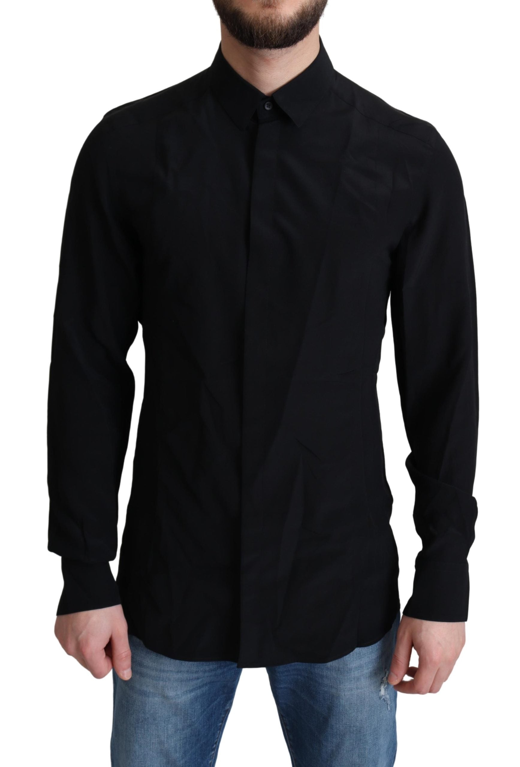 Absolut atemberaubend, 100% authentisch, brandneu mit Tags Dolce & Gabbana Das schwarze Seidenhemd von Dolce & Gabbana verkörpert das durch seinen scharfen Schnitt und die vielseitige Farbe mit verdecktem Frontverschluss.