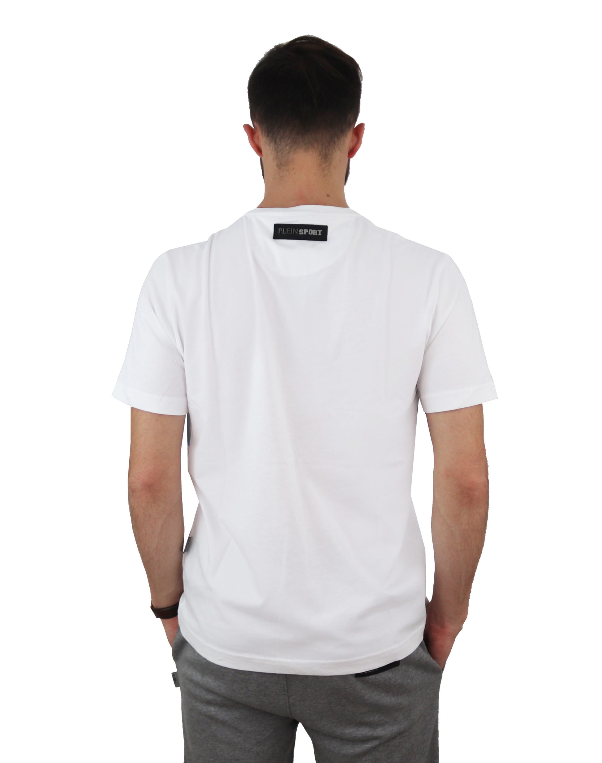 Herren-T-Shirt von Plein Sport aus Baumwolle mit Druck auf der Vorderseite und geprägtem Logo auf der Rückseite. In Italien hergestellt