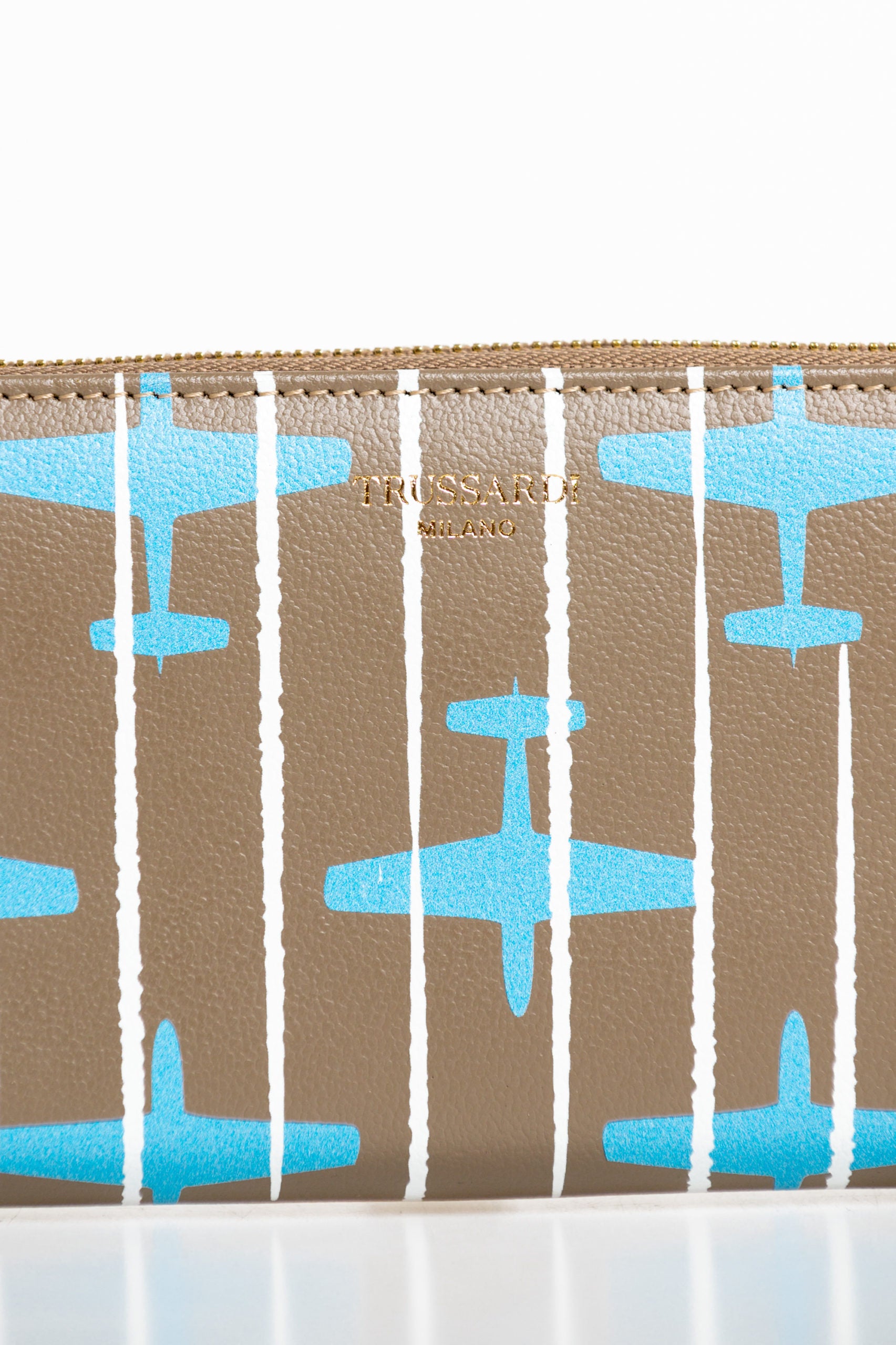 Gestreiftes All-Over-Print-Lederportemonnaie mit Zip-Verschluss mit Flugzeugmotiv. Innenfächer und Reißverschlusstasche. Größe: Tiefe 3 Cm. Breite 19 Cm. Höhe 11 cm