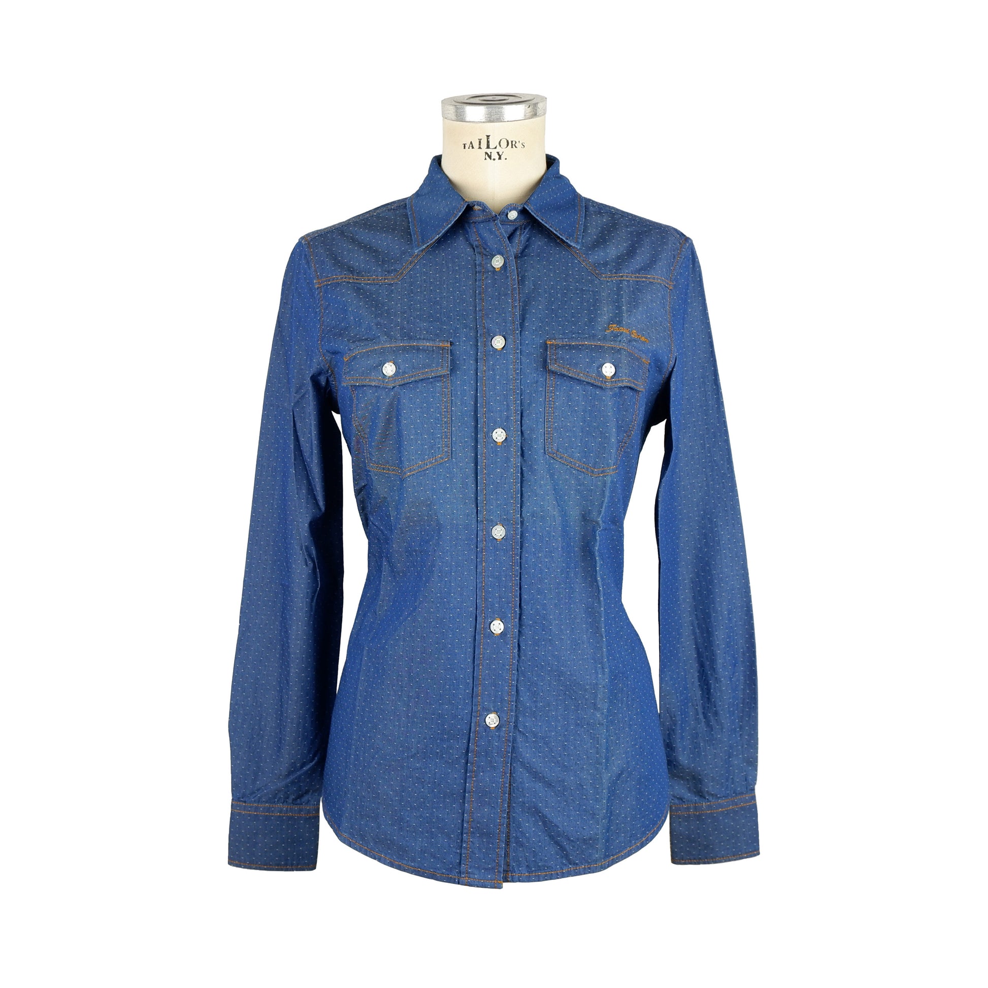Jacob Cohen Damenbluse aus blauer Baumwolle mit gemusterten Nähten und Brusttaschen. In Italien hergestellt