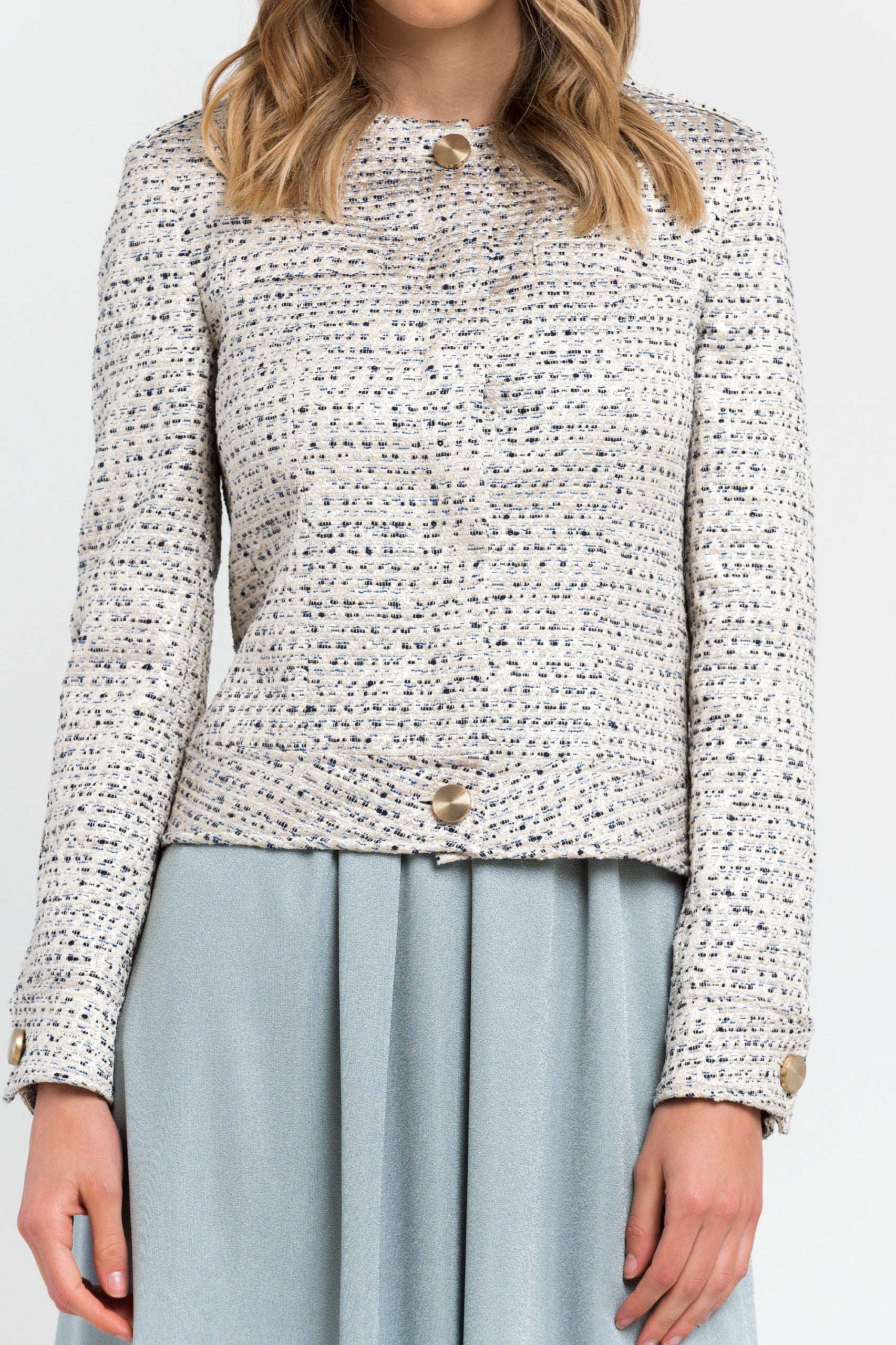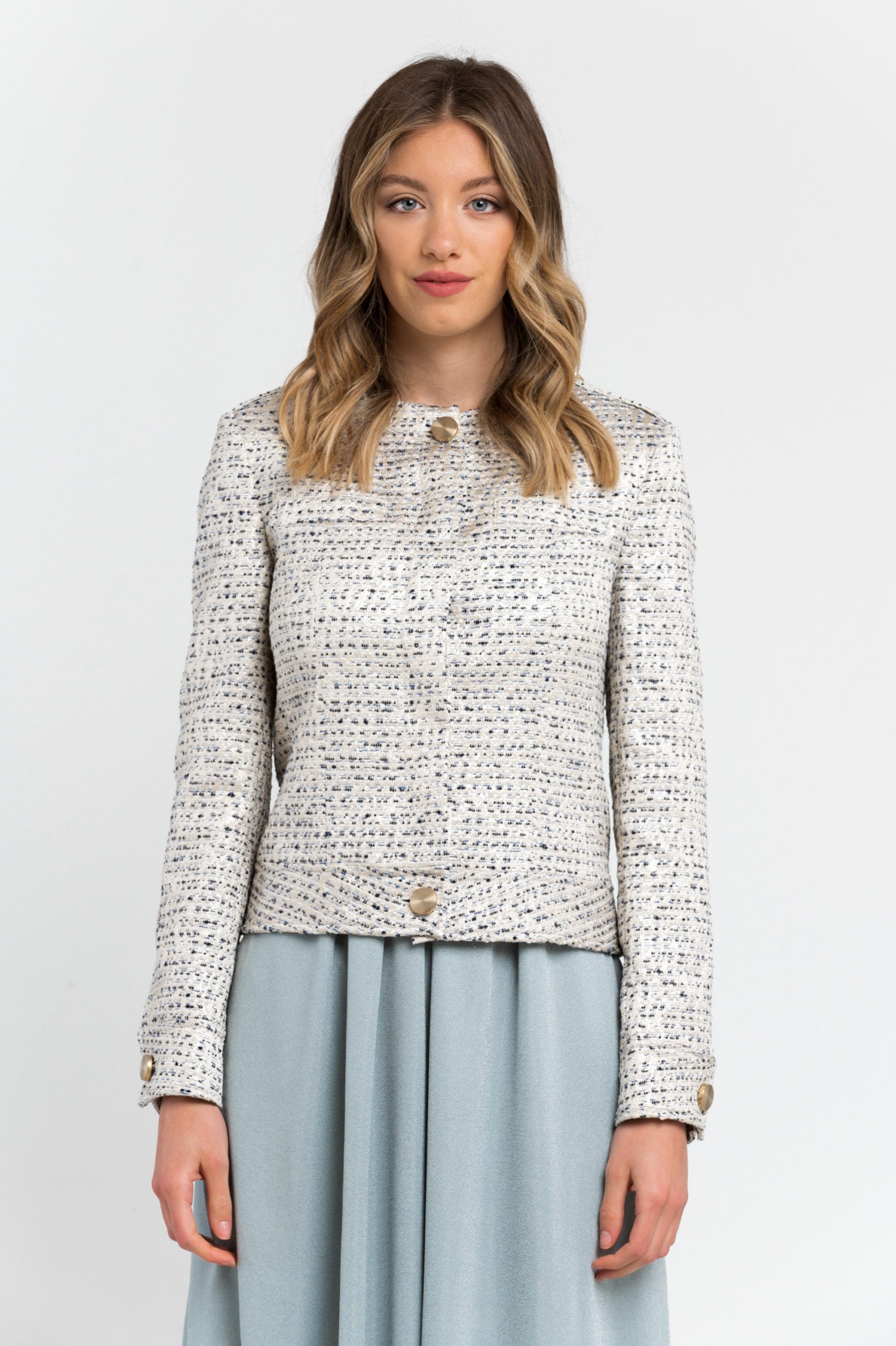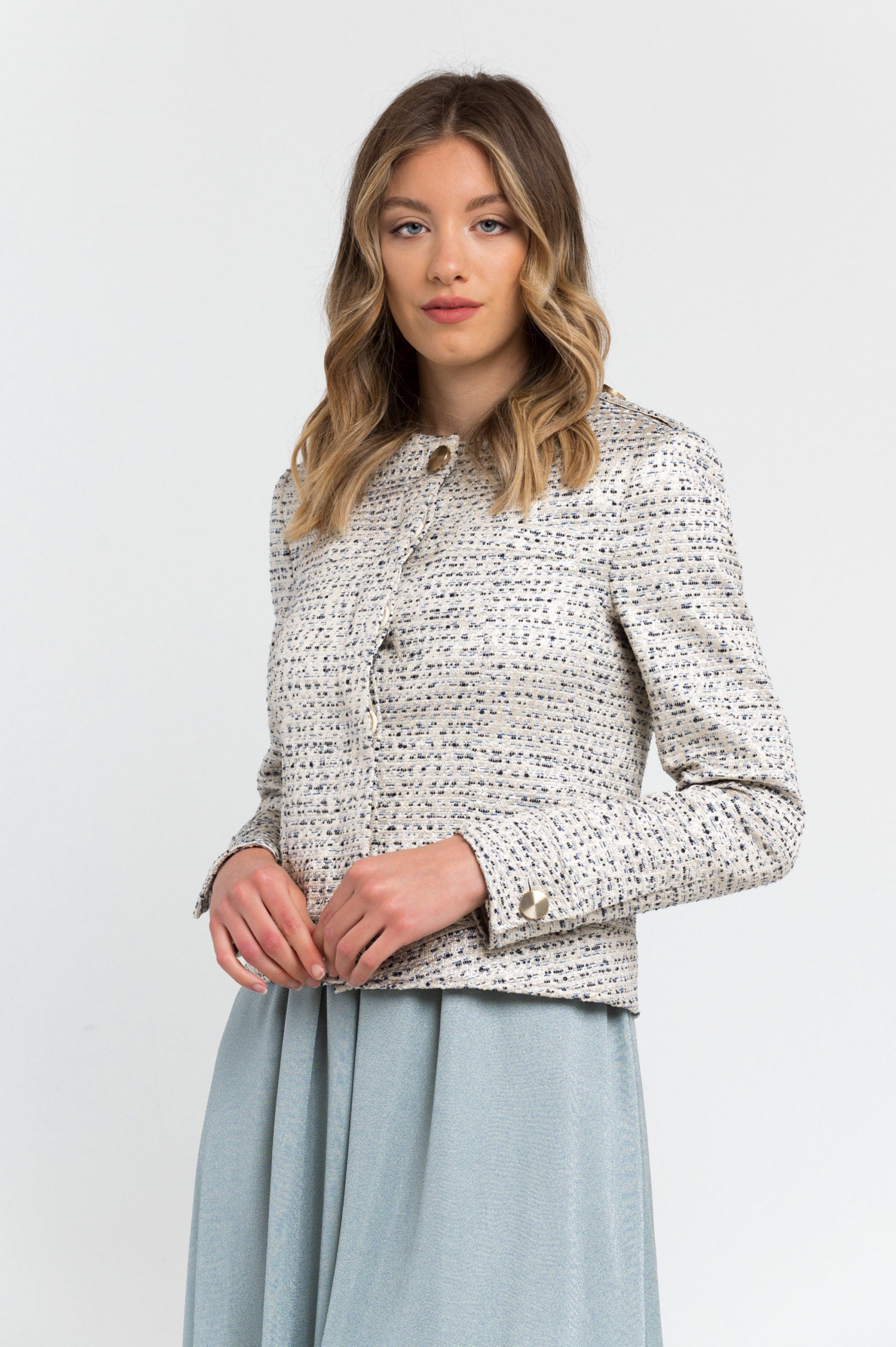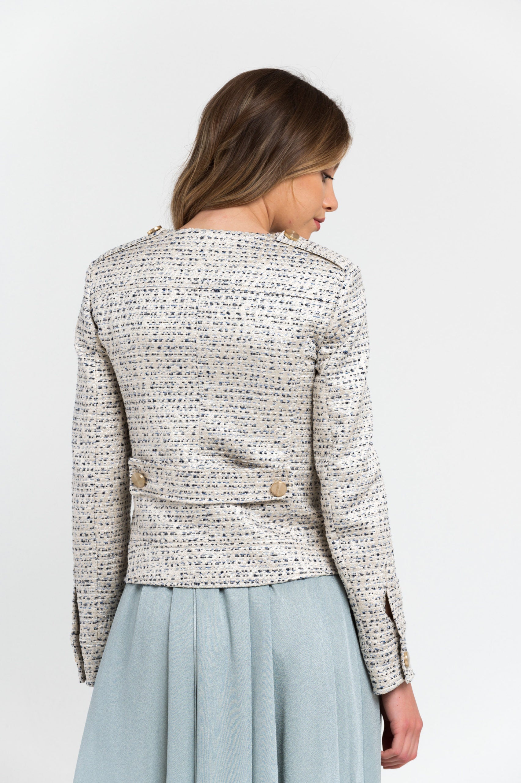 Blazer aus einer Baumwollmischung mit Jacquard-Details, die ein gestreiftes. gepunkteten Muster-Effekt. Epauletten an den Schultern. Halbgürtel auf der Rückseite und Manschetten mit glänzenden klassischen Knöpfen.
