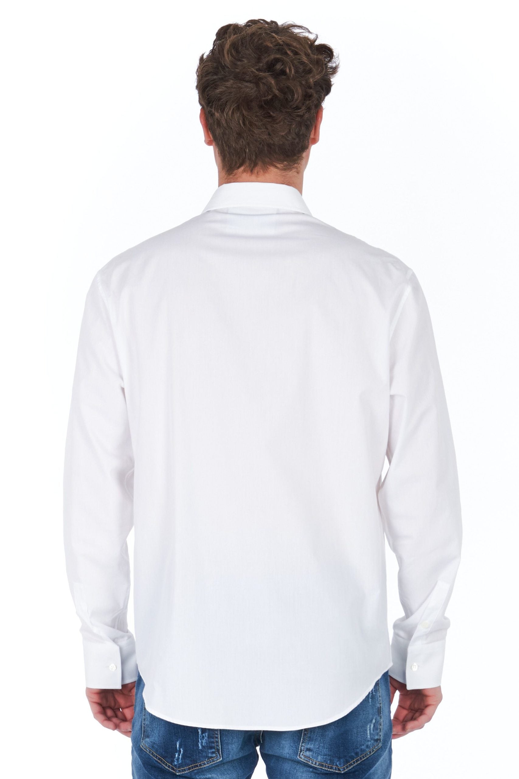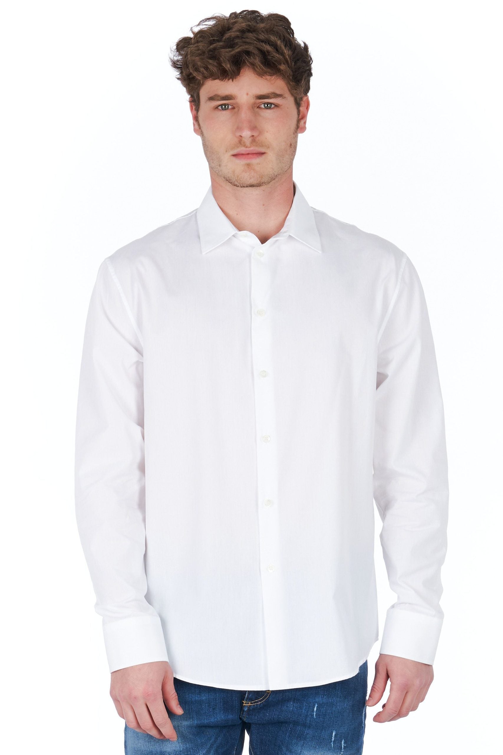 Weißes Hemd mit Knöpfen. Solide Farbe und lange Ärmel. Hergestellt aus Baumwolle.