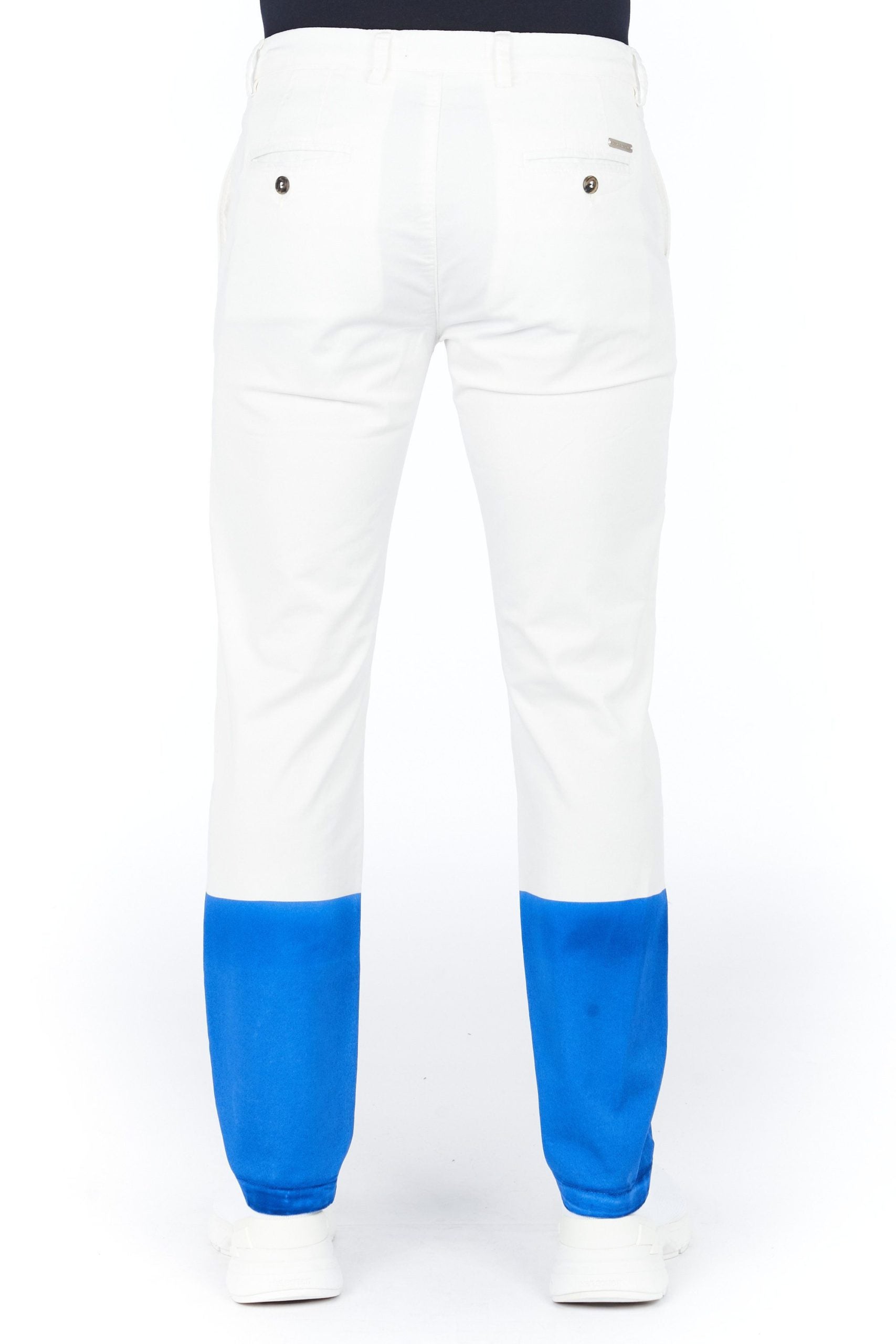Weiße Hose aus Baumwolle. Boden der Hose gefärbt hellblau. Knopf- und Reißverschluss. Gürtelschlaufen an der Taille. Zwei Taschen an den Seiten und zwei auf der Rückseite.