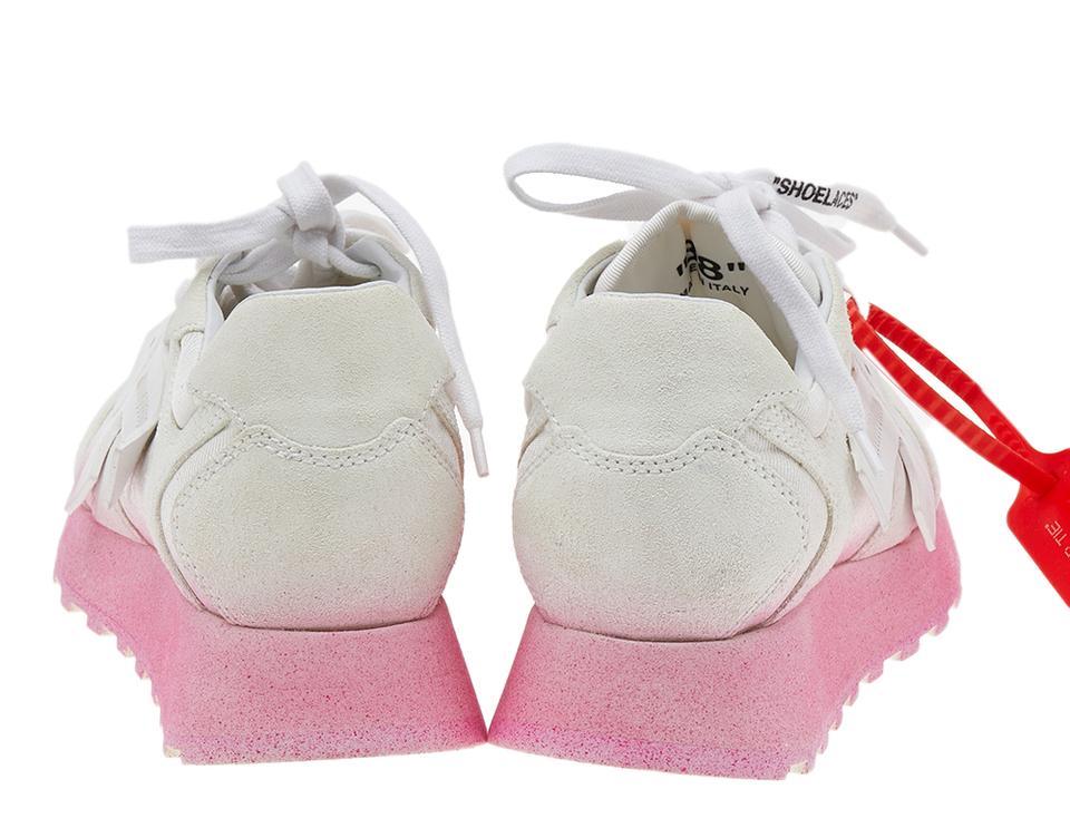Off-White Sneakers aus Textil und Wildleder, Gummisohle mit rosa Sprüheffekt, ikonisches Pfeil-Logo an der Seite.