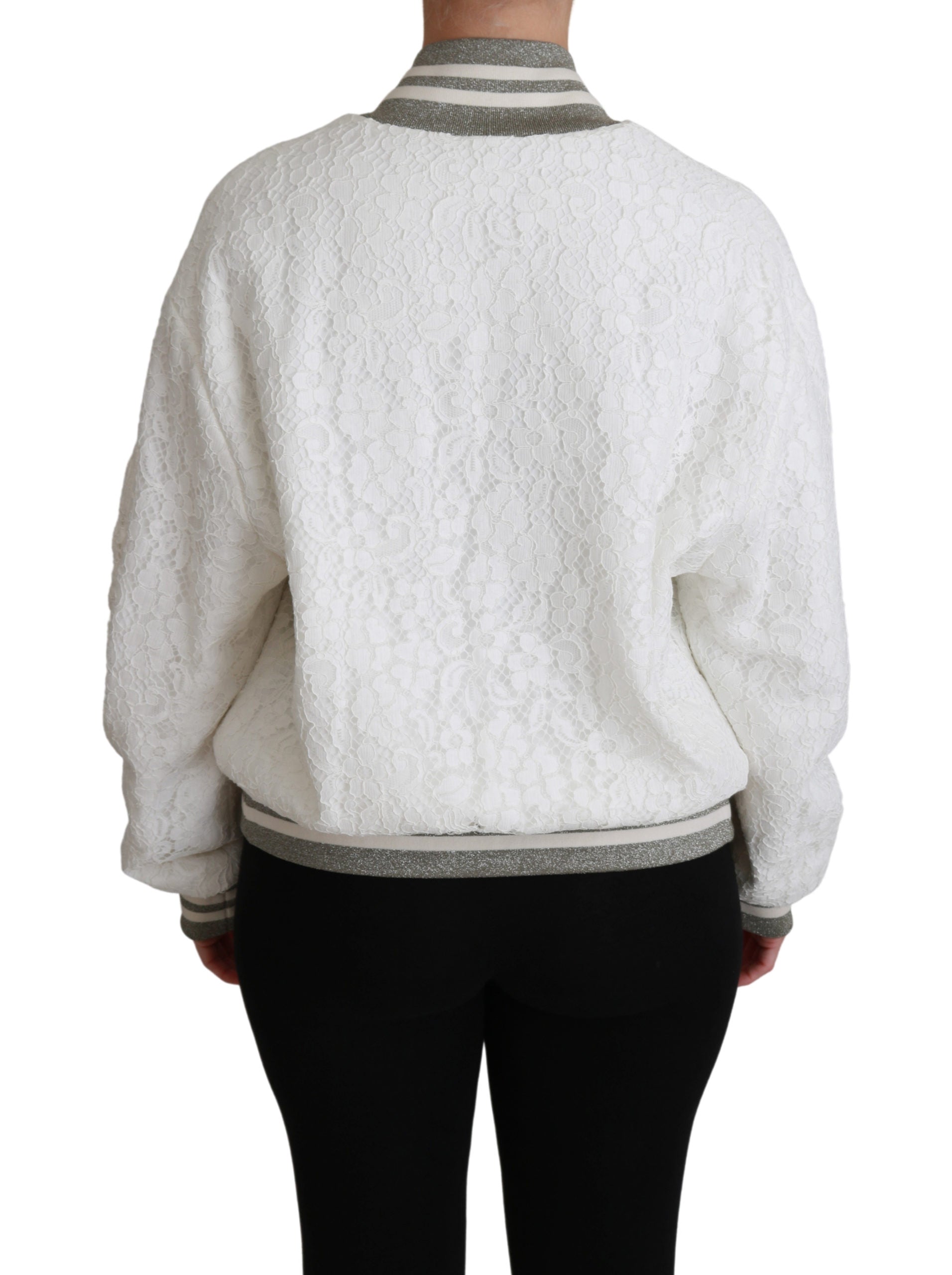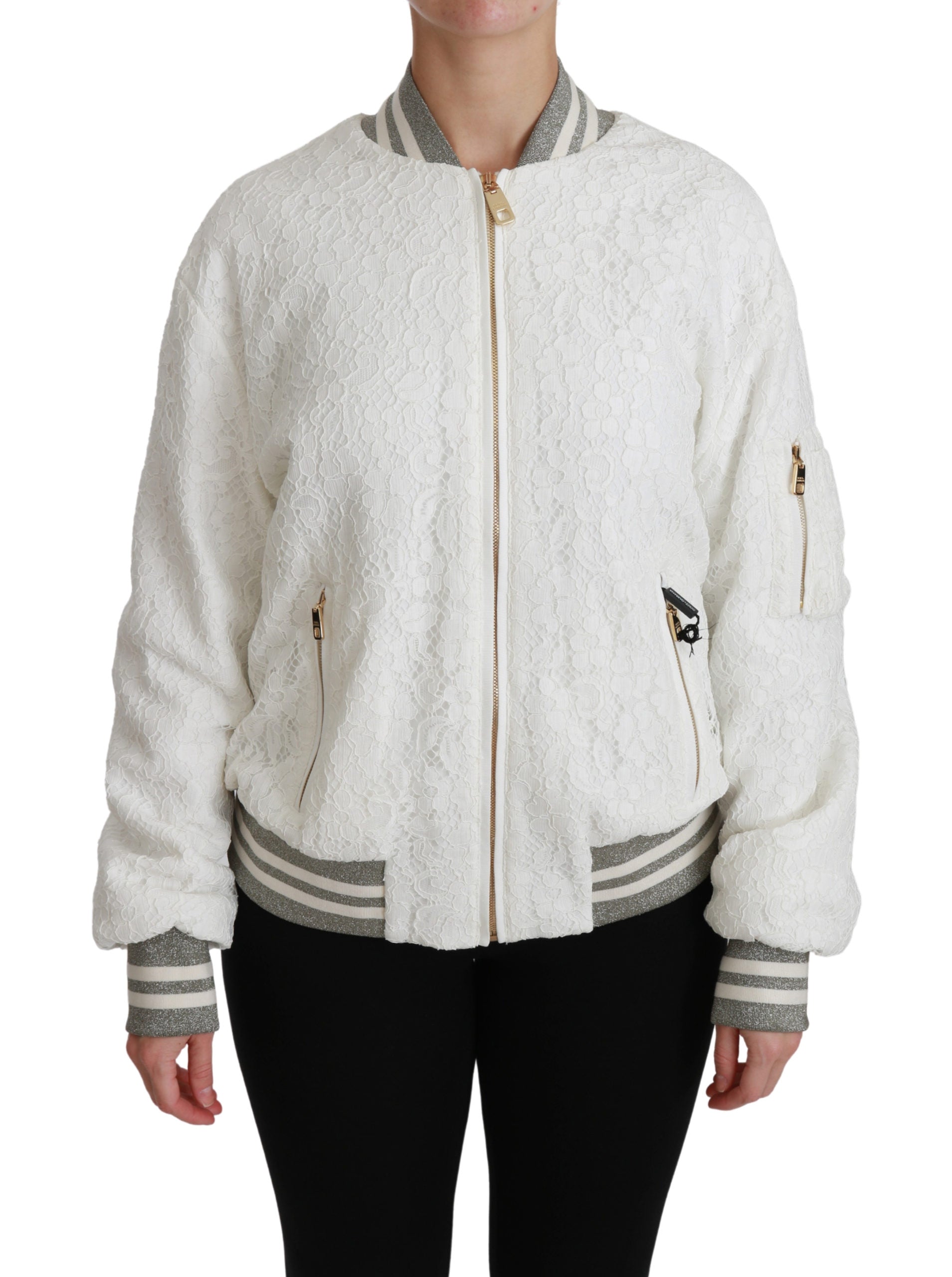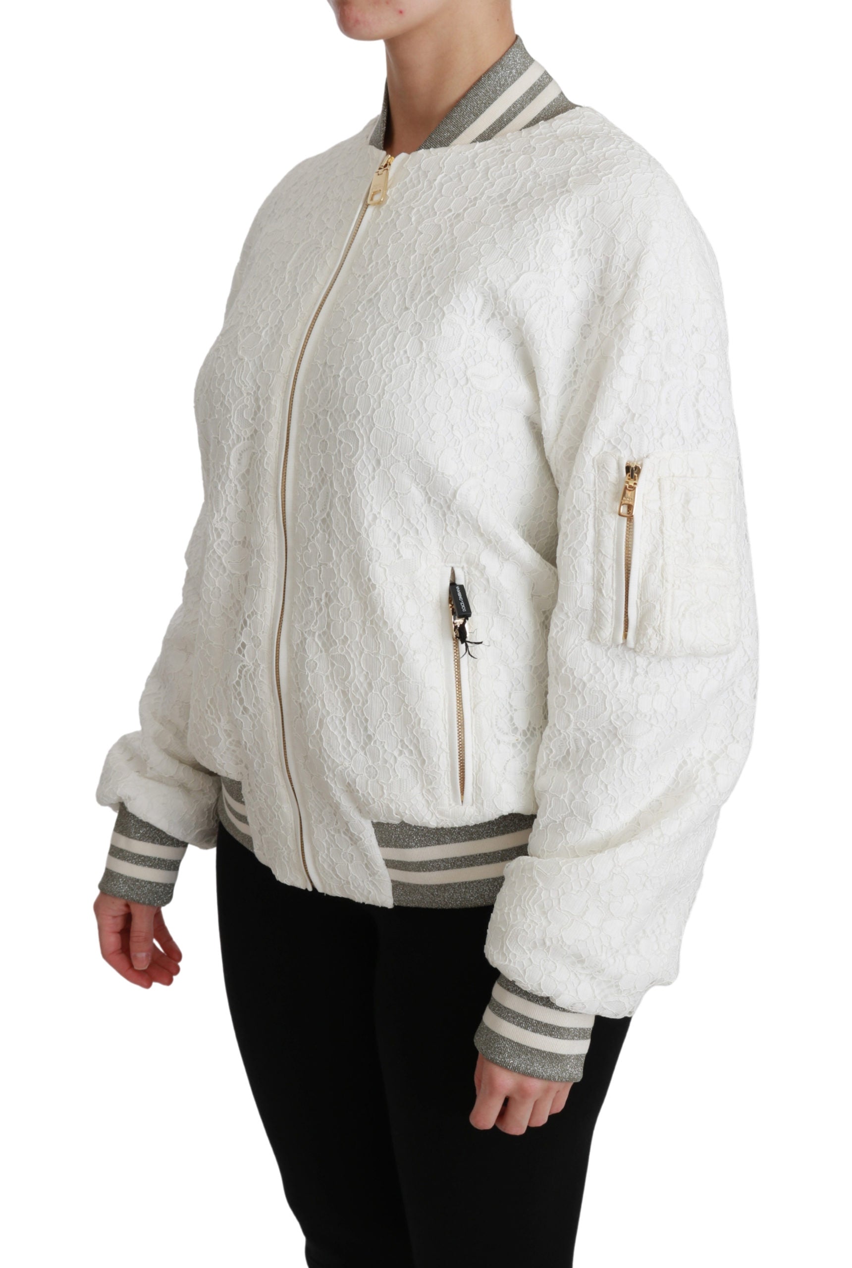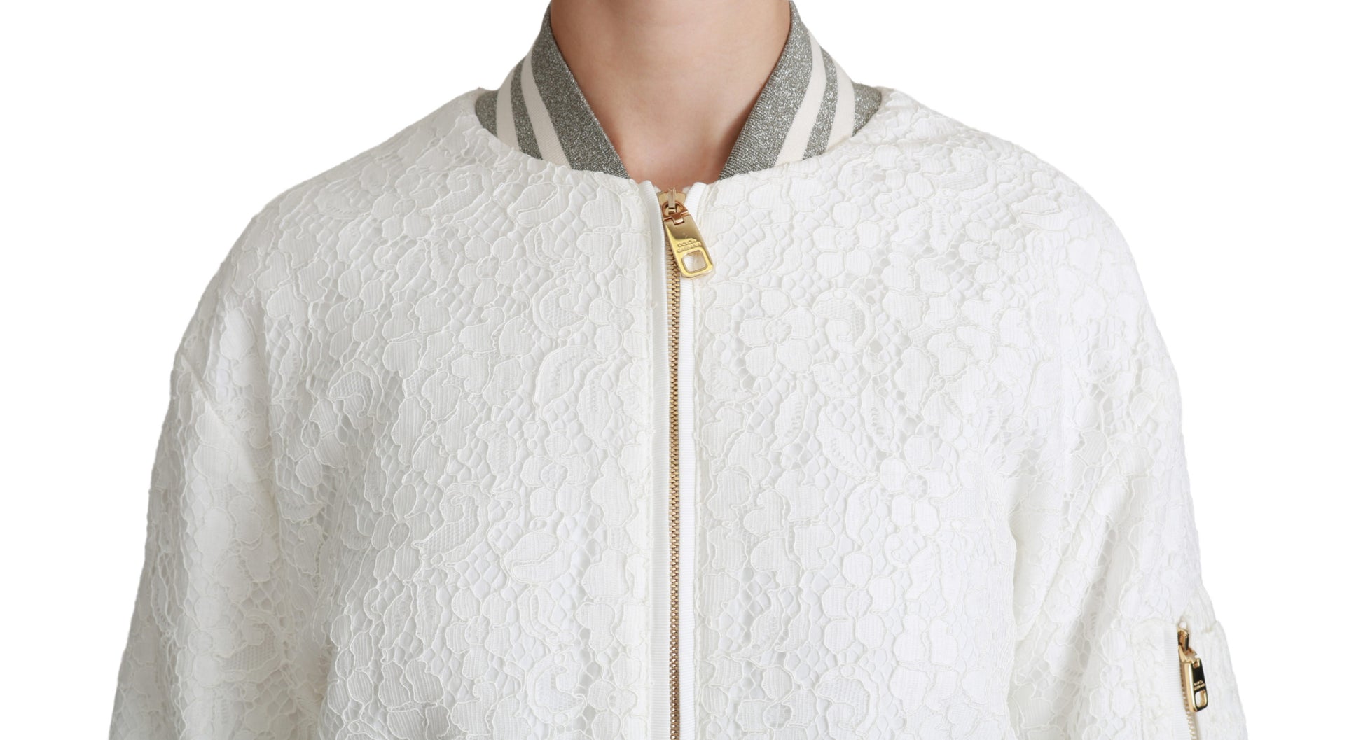 Weißer Spitzen-Bombermantel mit durchgehendem Reißverschluss Baumwolljacke