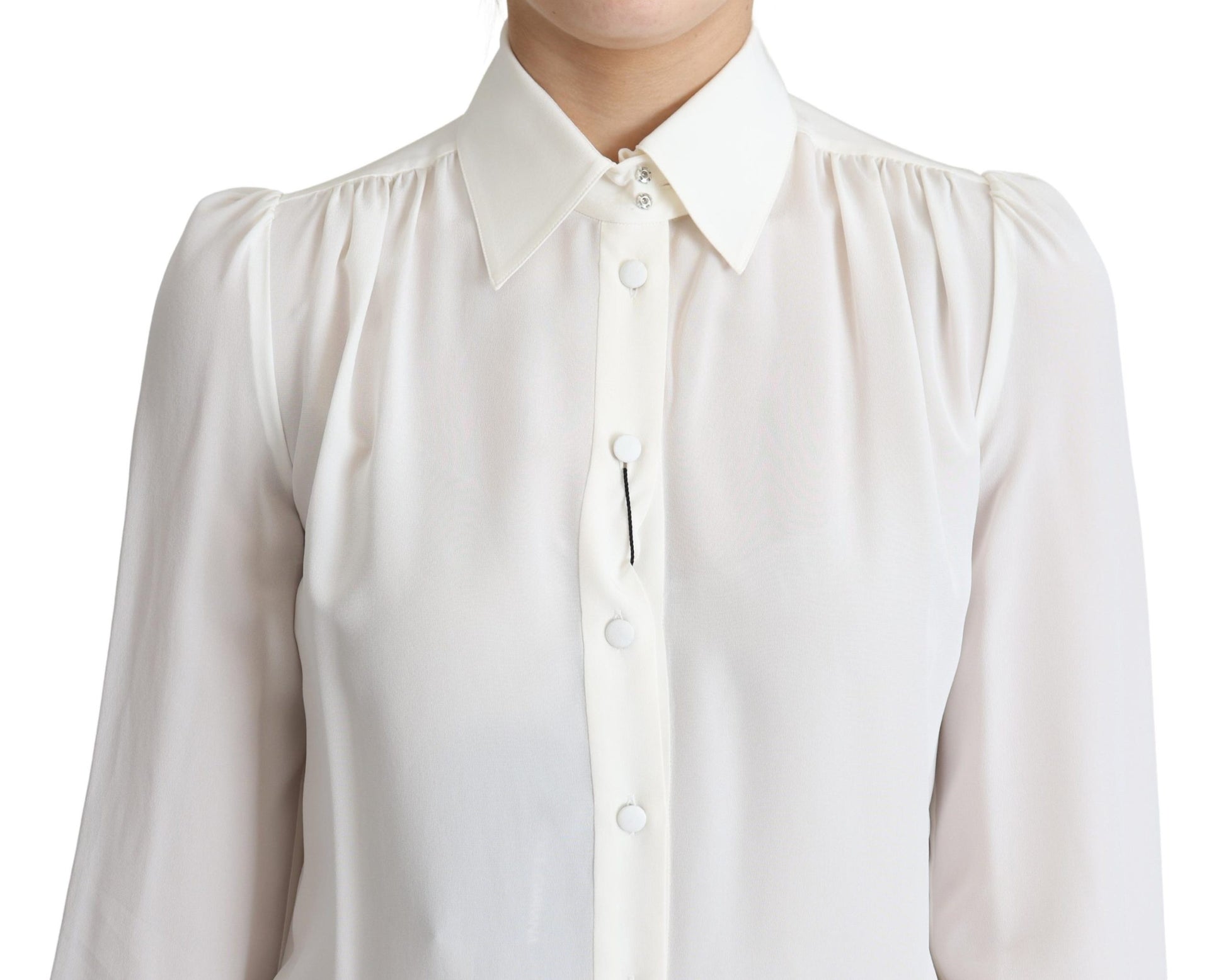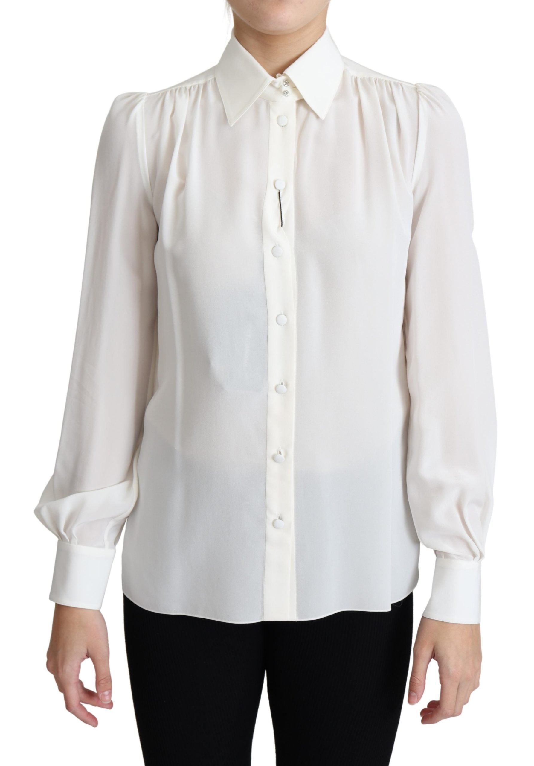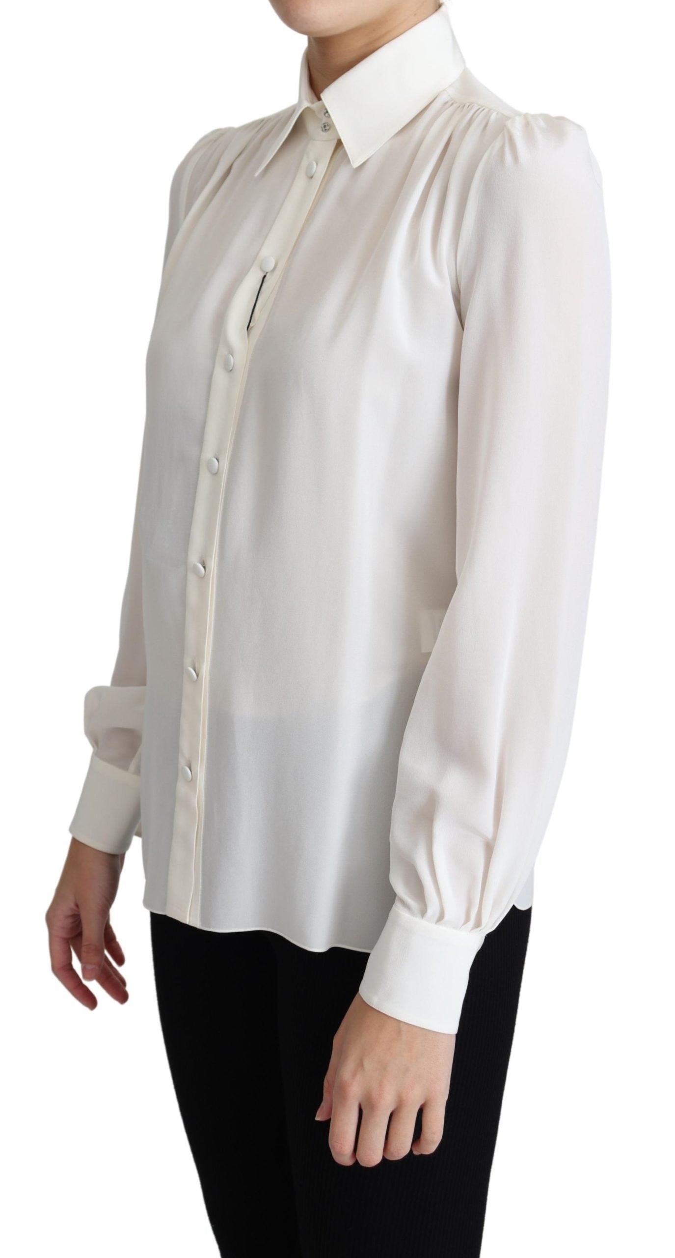 Wunderschönes, brandneues, 100% authentisches Dolce & Gabbana Seiden-Crêpe-Hemd mit gekräuselten Schultern. Zentraler Knopfverschluss.