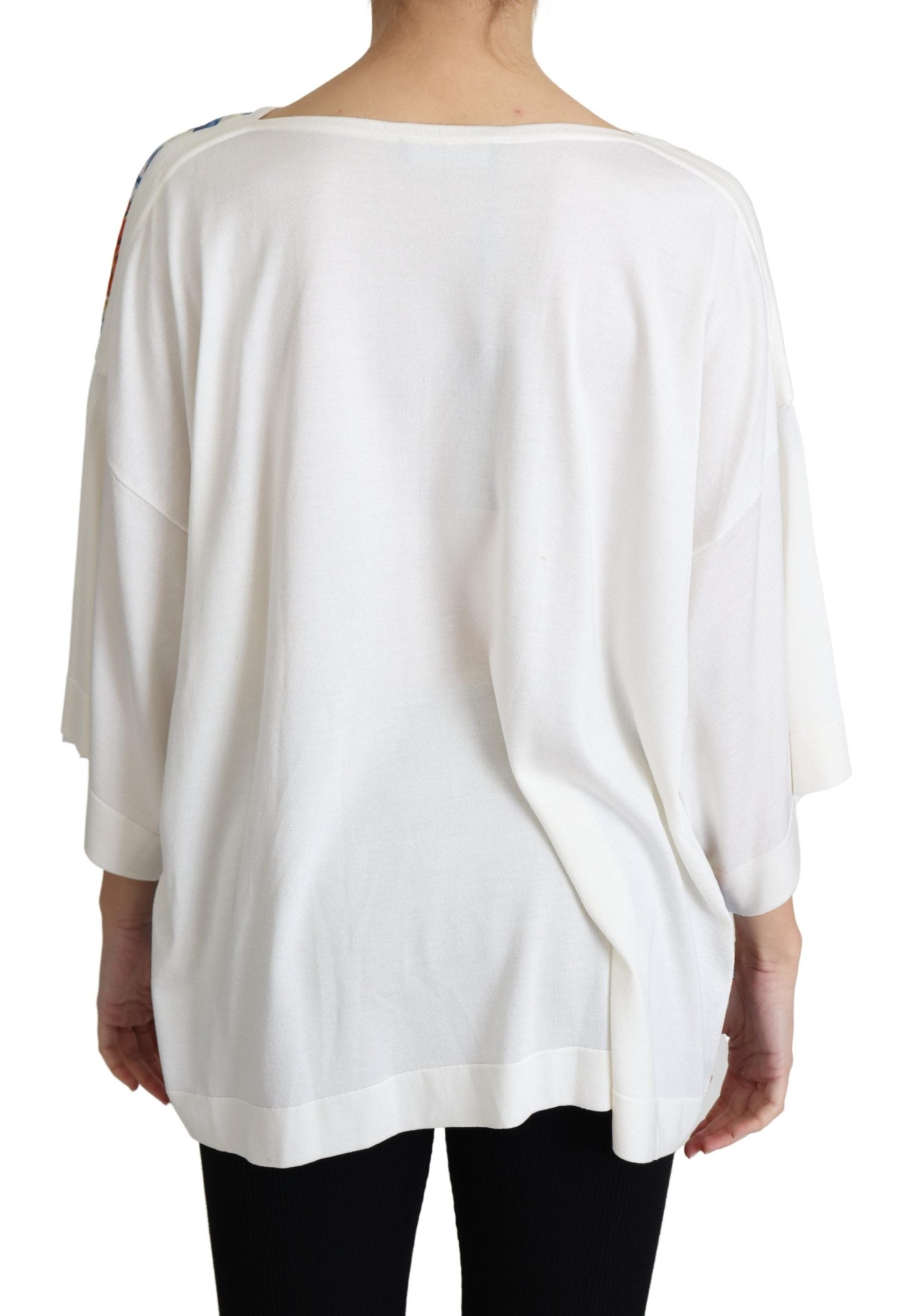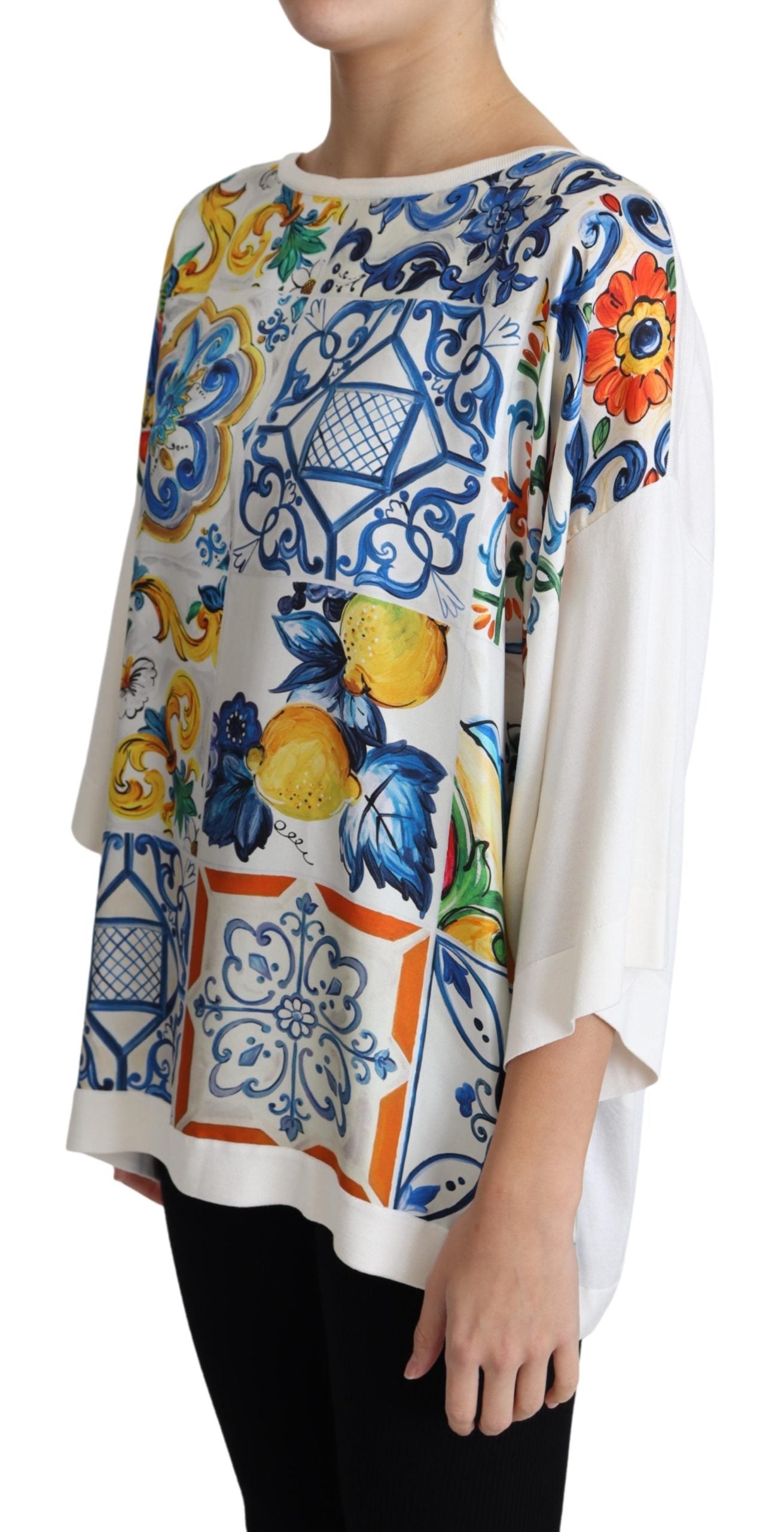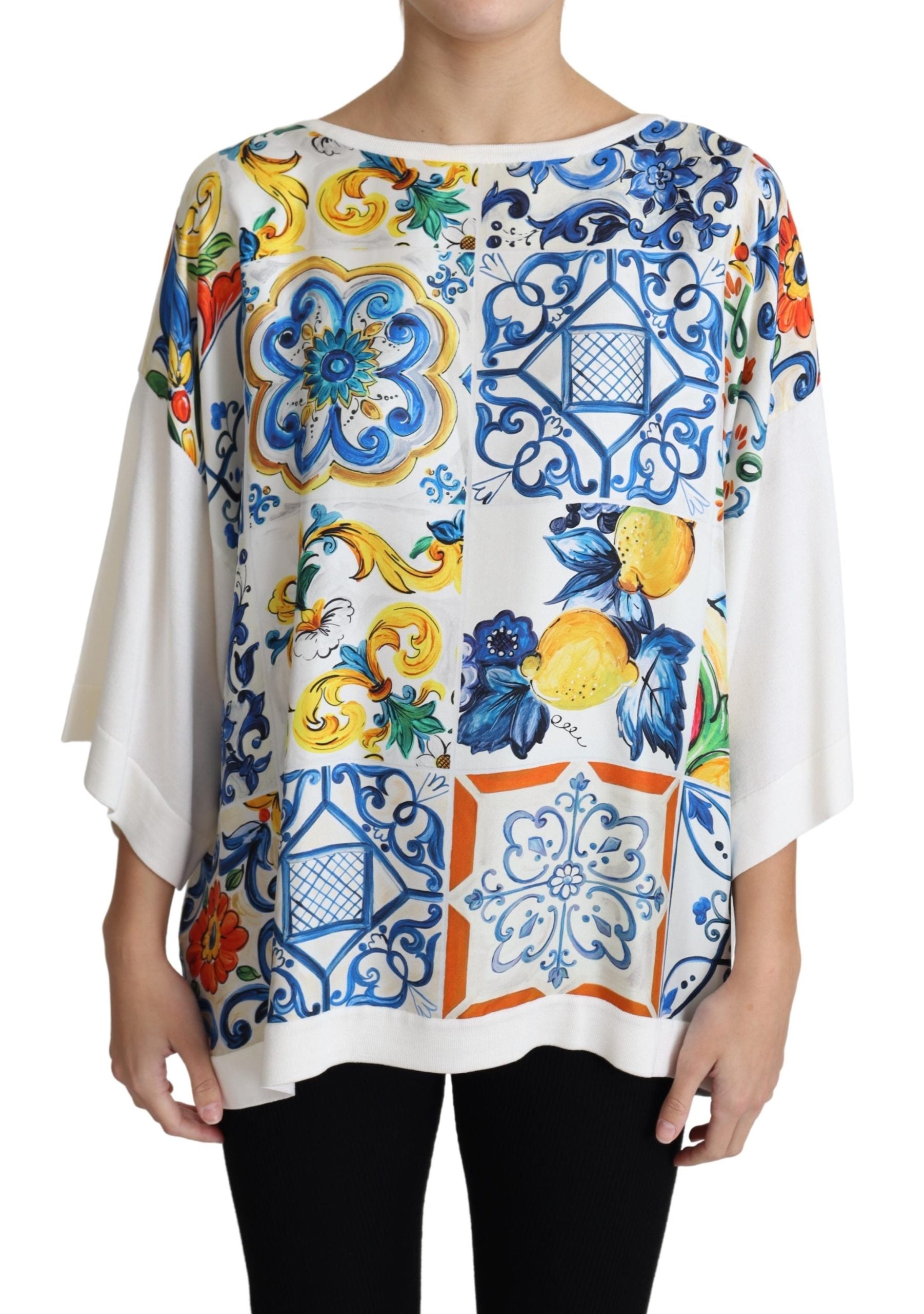 Wunderschönes, brandneues, 100% authentisches Dolce & Gabbana-Topaus reiner Seide in Off-White mit einem "Majolica"-Druck auf der Vorderseite. Das übergroße Oberteil hat lange Ärmel, einen Rundhalsausschnitt und eine lockere Passform.