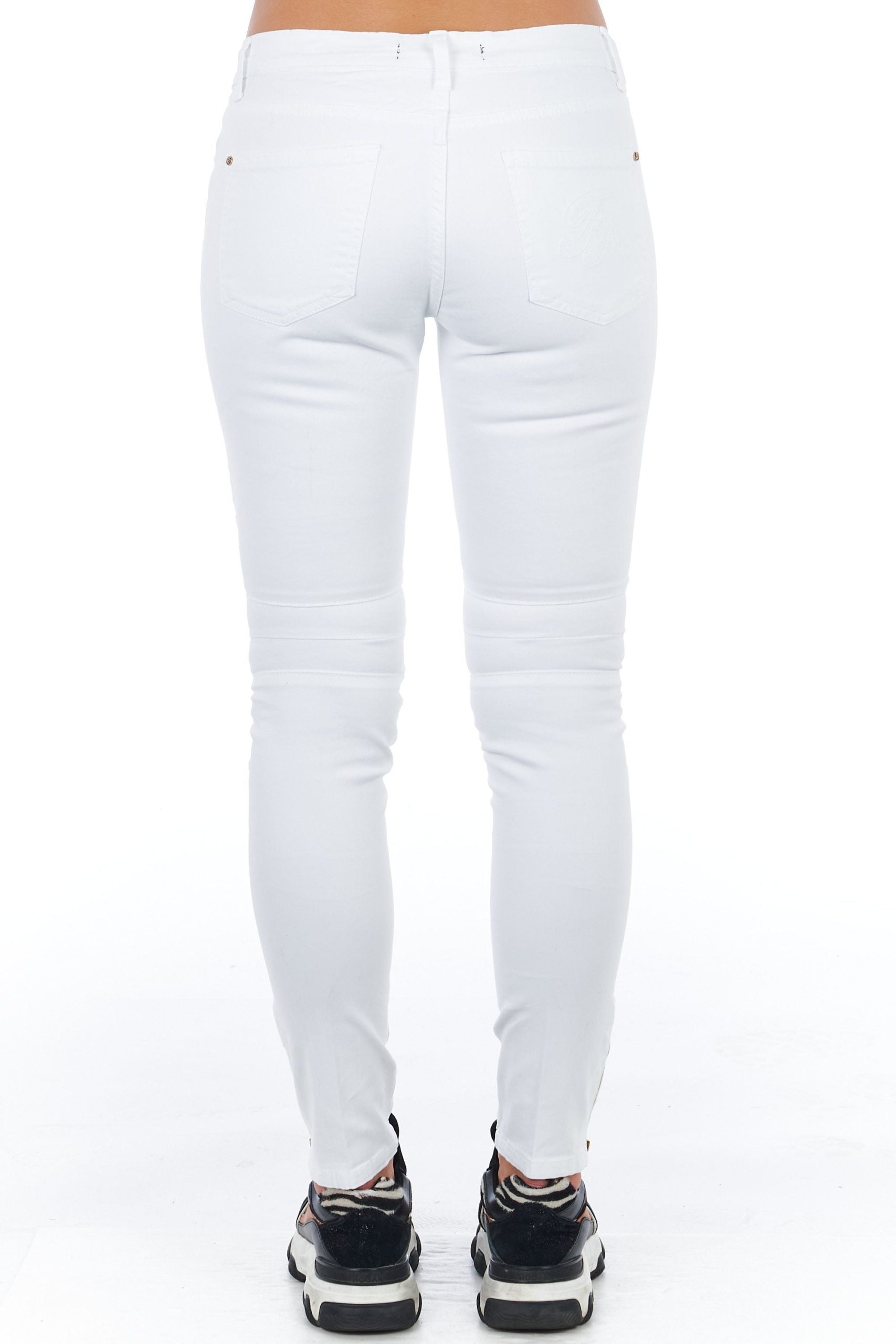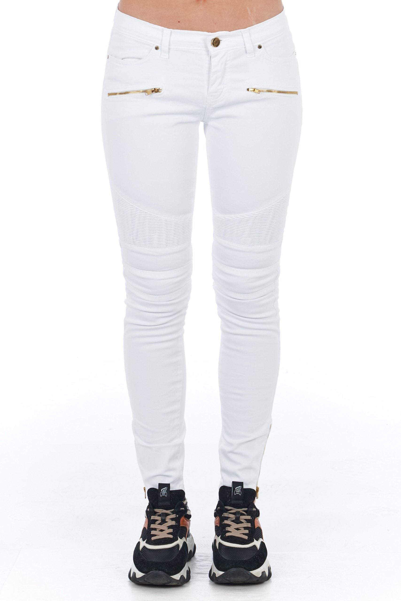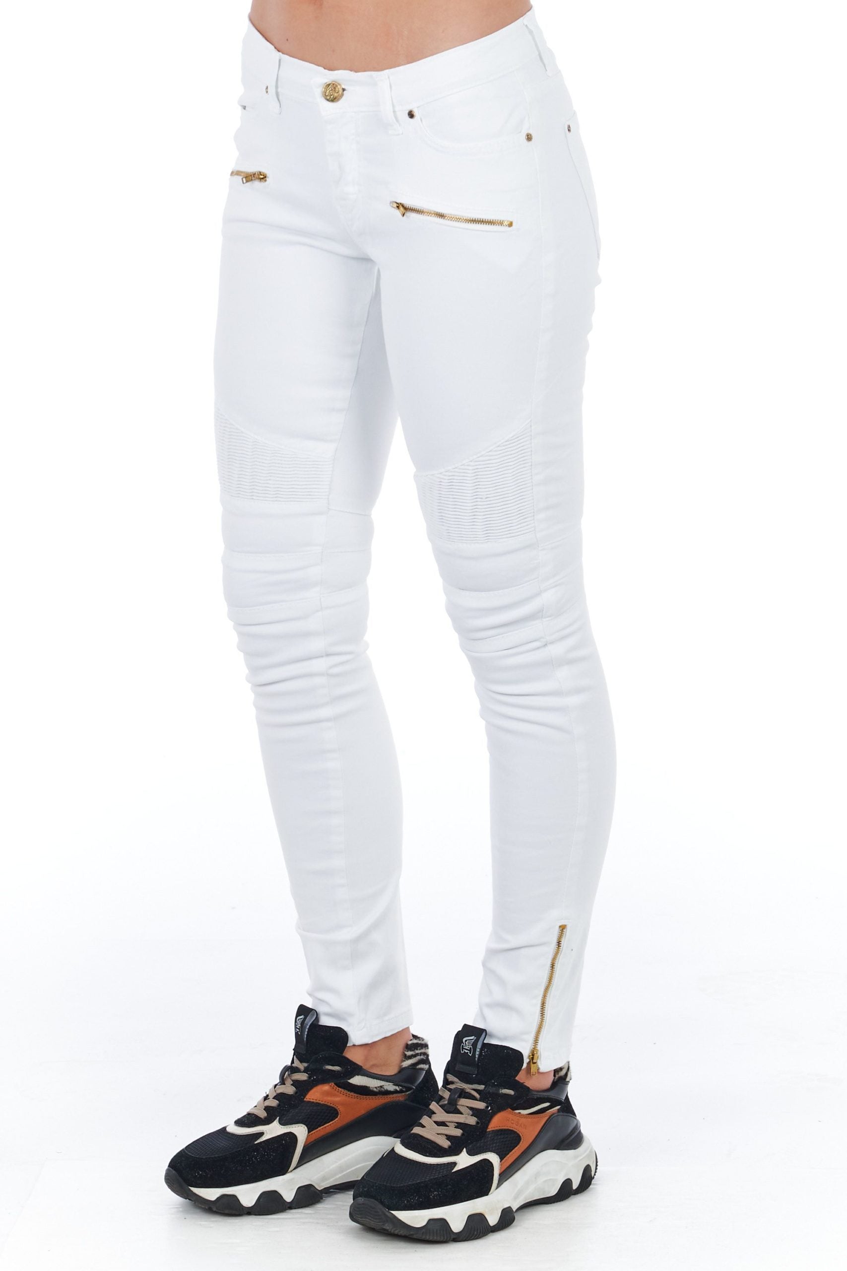 Biker-Stretch-Denim-Jeans mit getragener Waschung. Niedrige Taille und mehrere Taschen. Verschluss vorne mit Reißverschluss und Knopf.