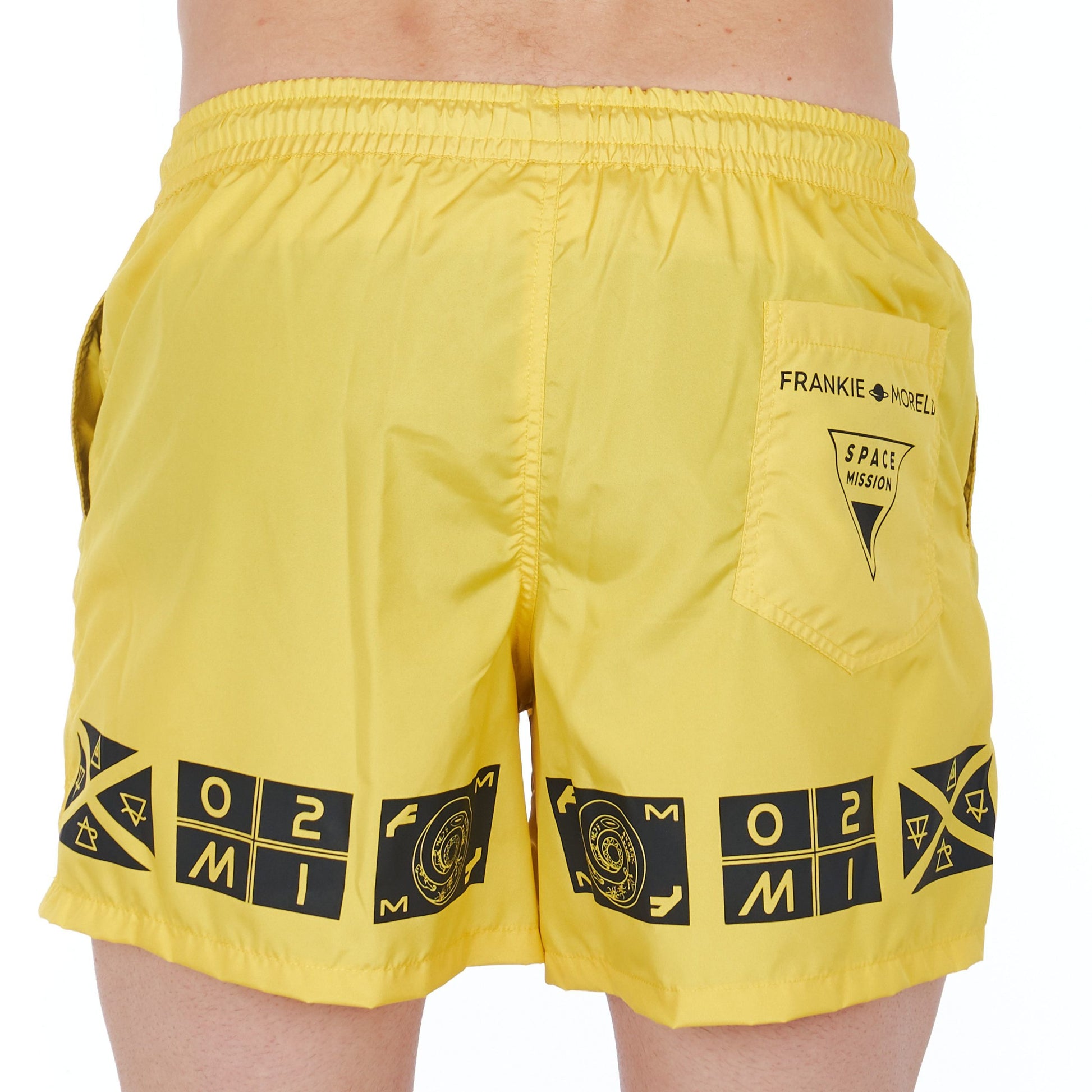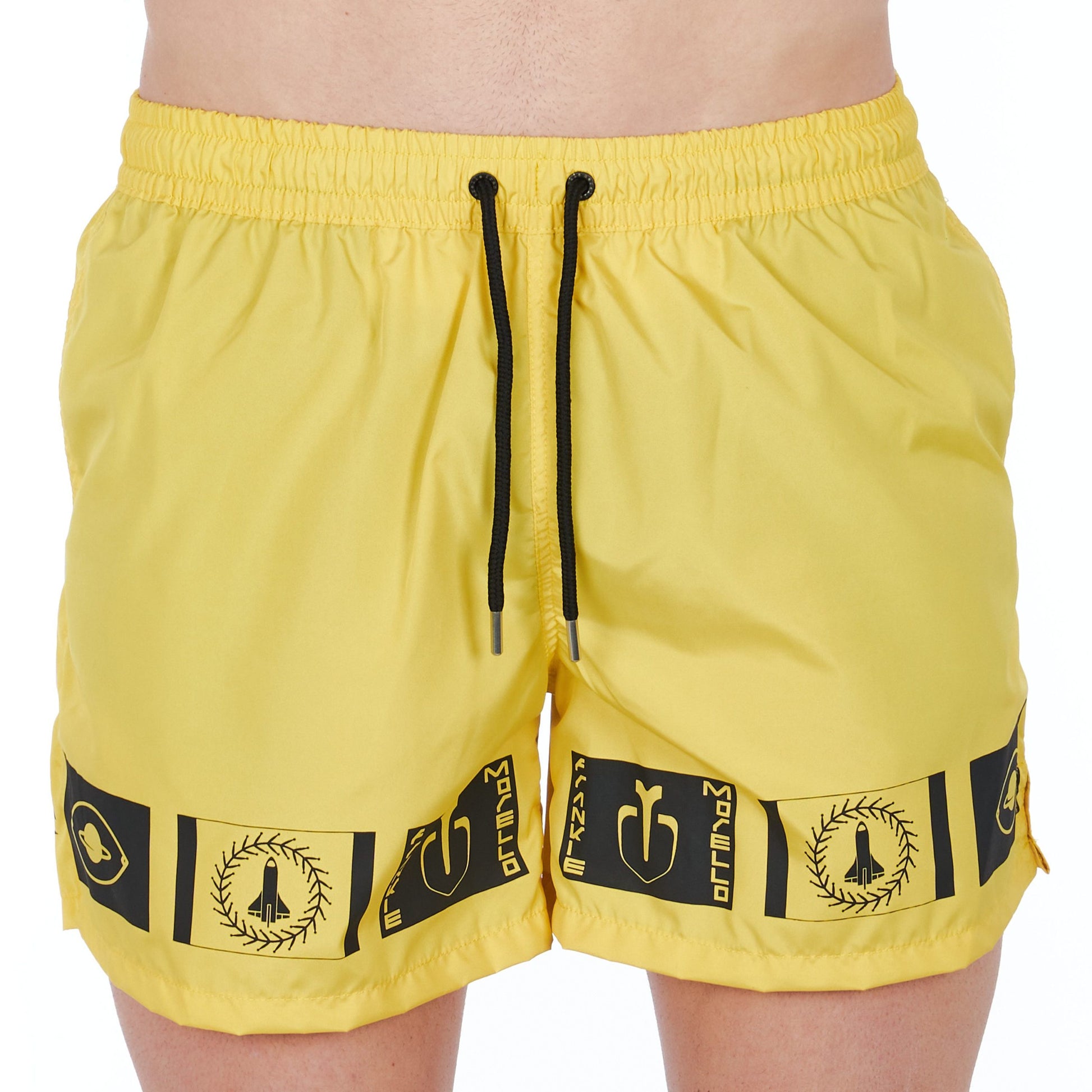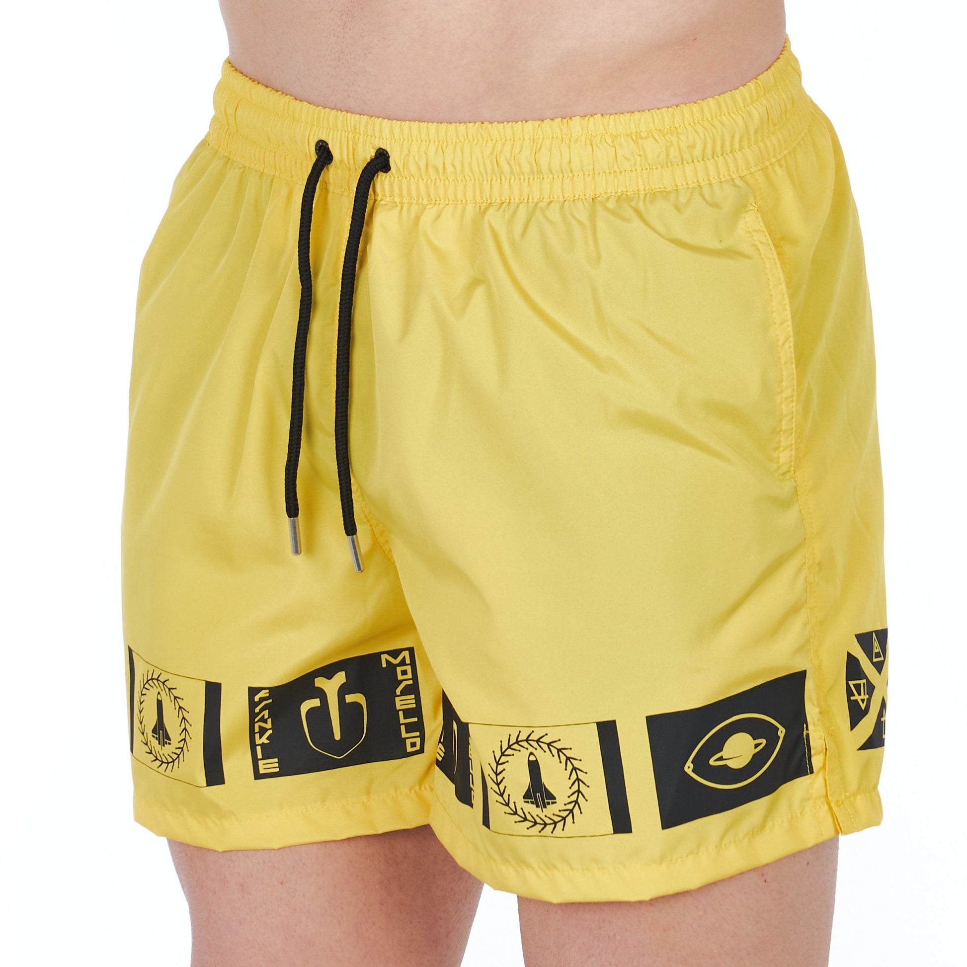 Gelb gemusterte Badeshorts mit Kordelzug.
