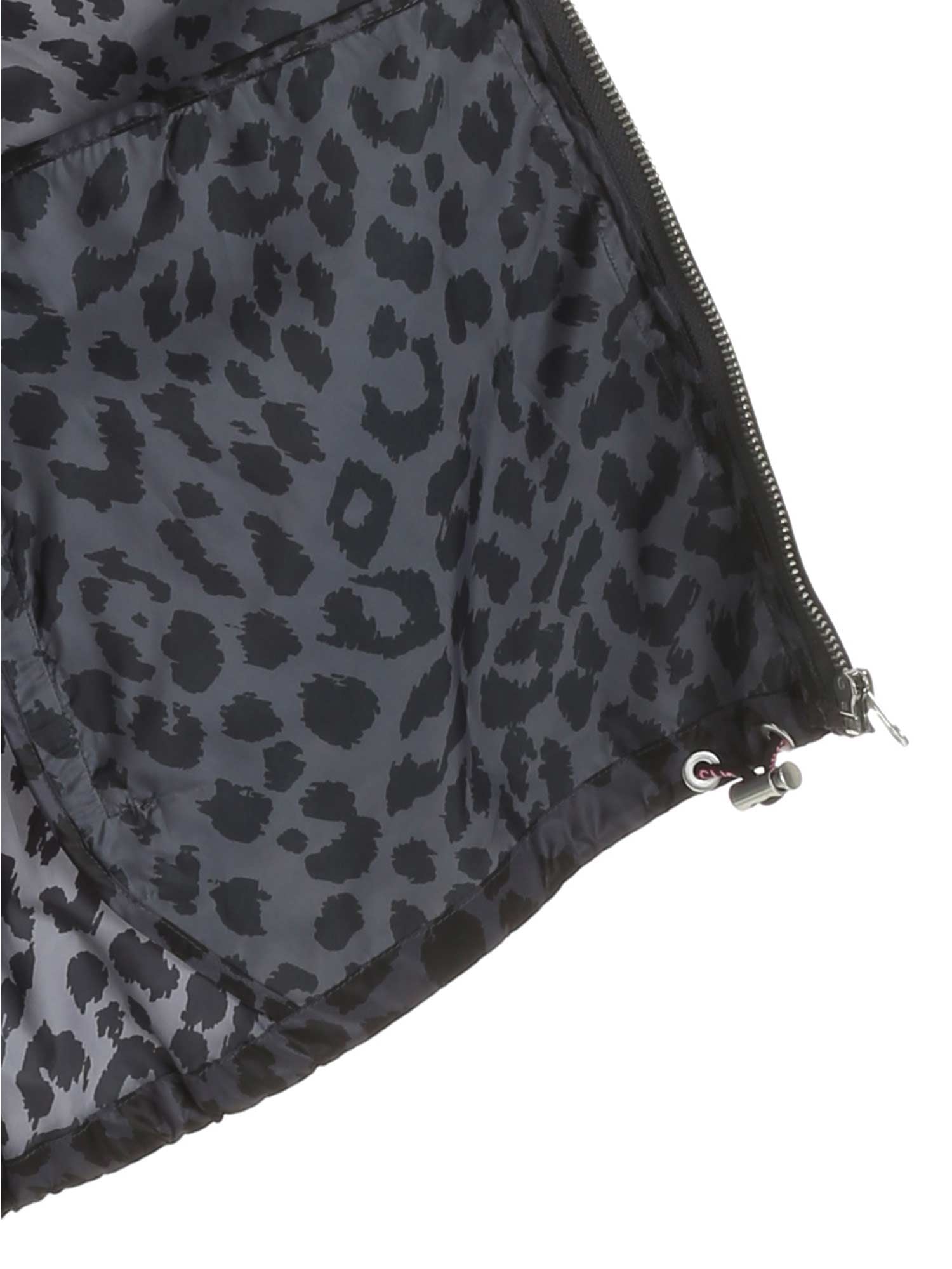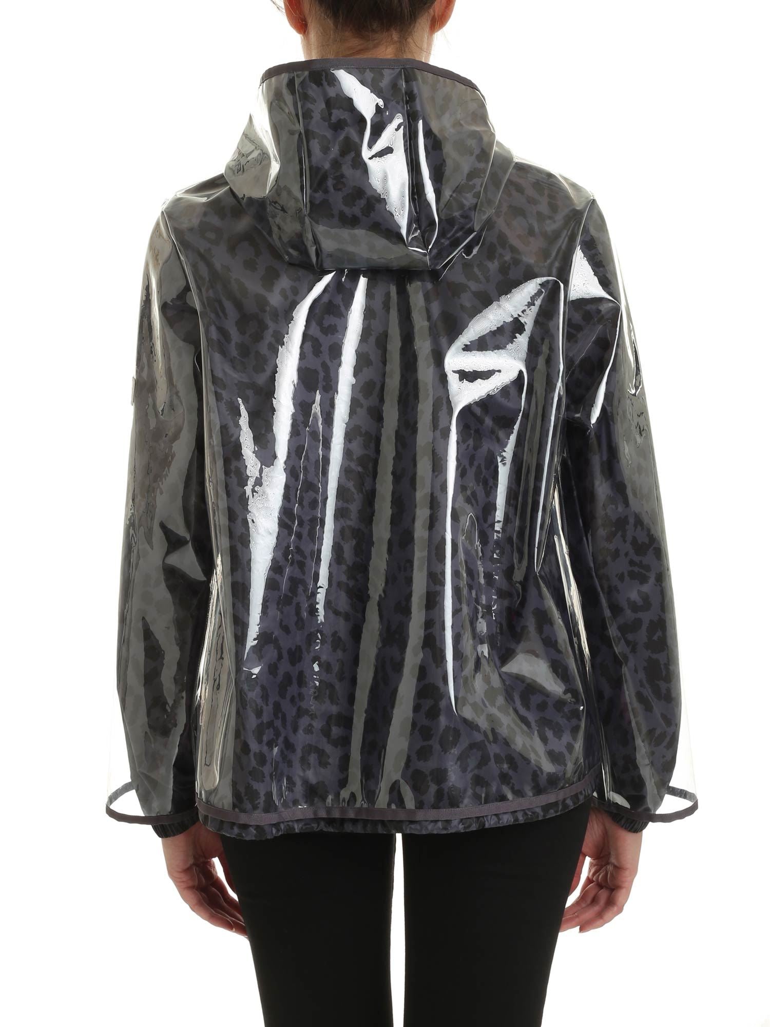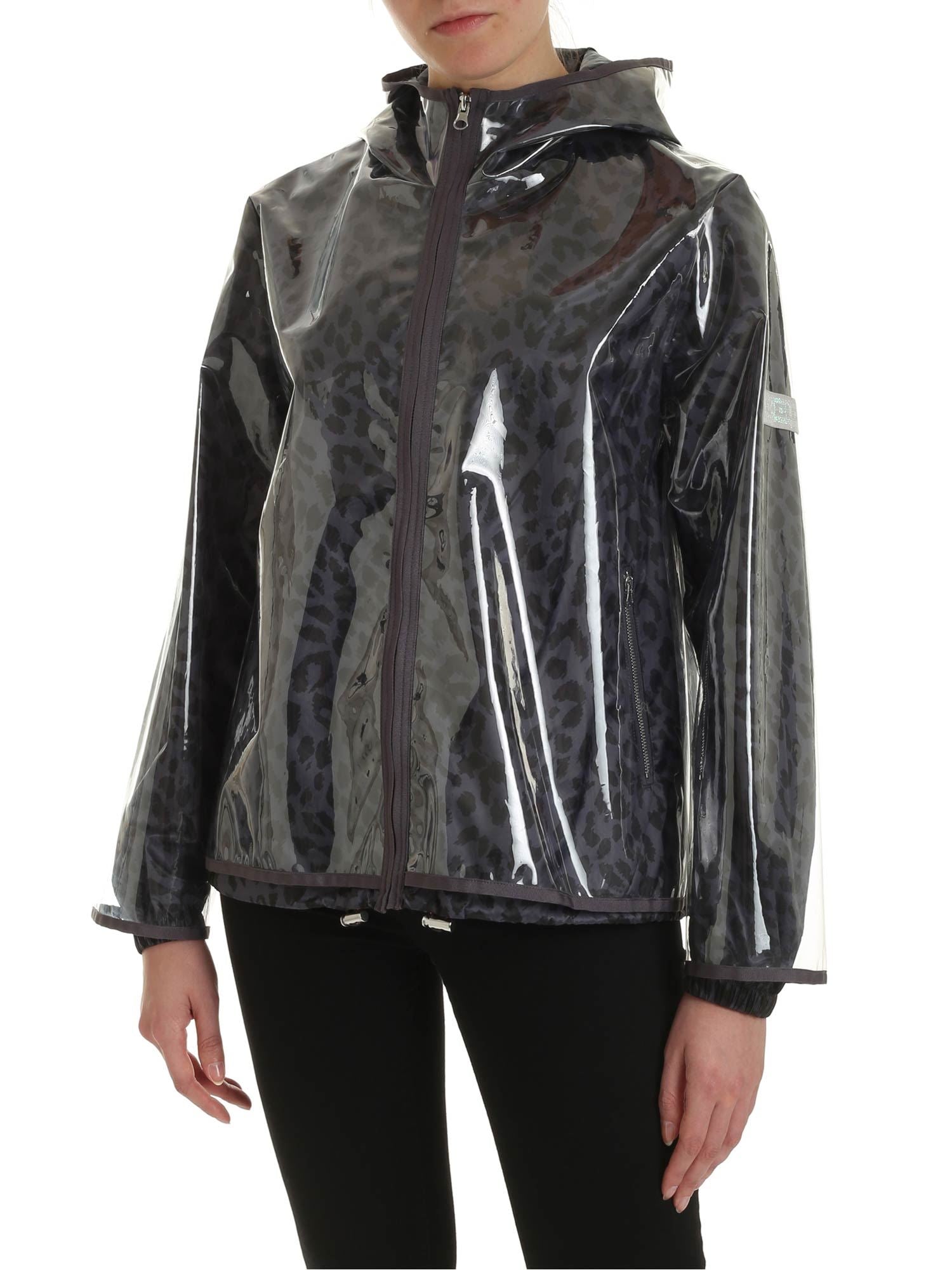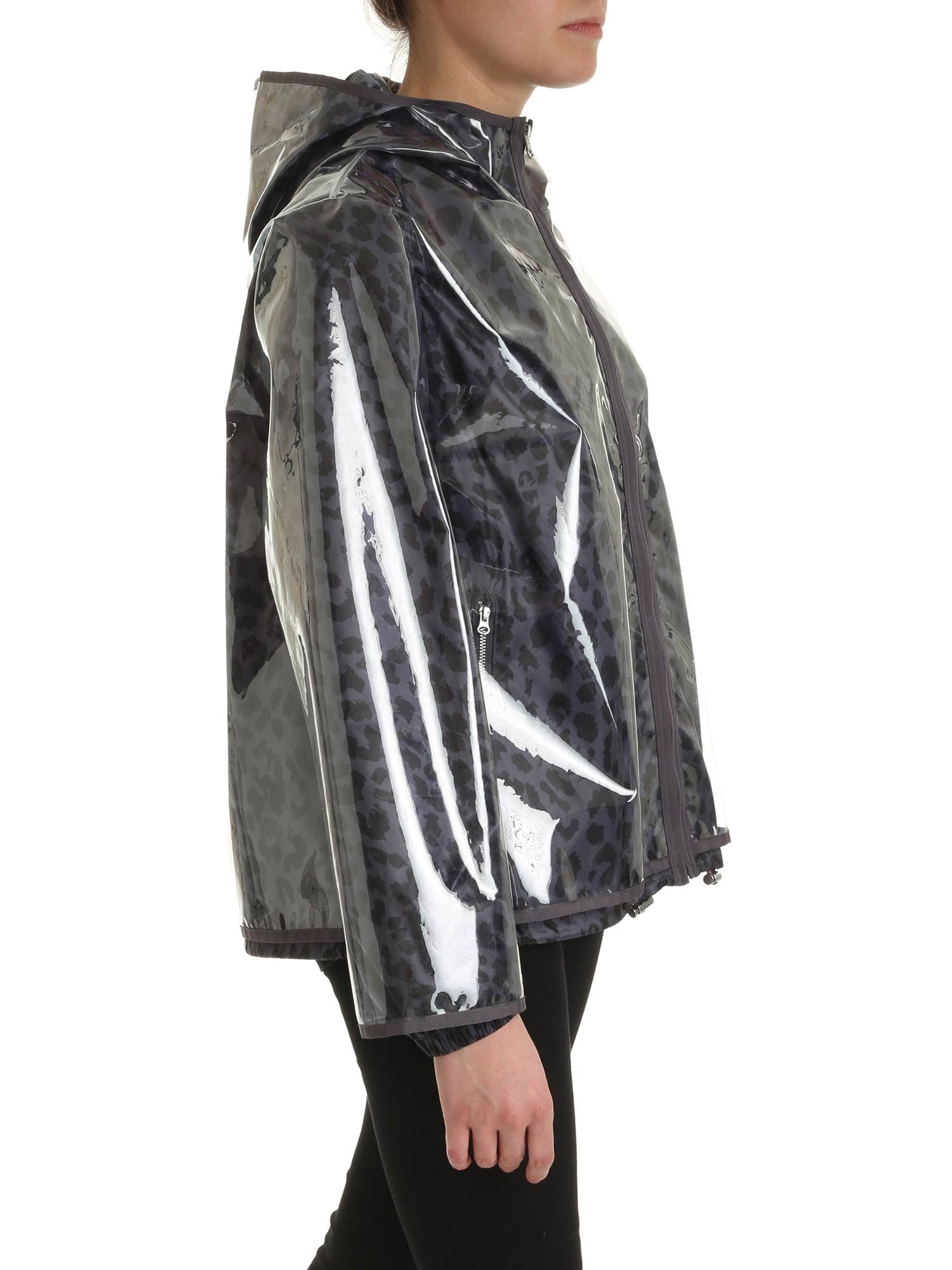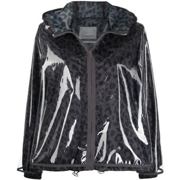 Wasserdichte Kapuzenjacke von Pinko aus technischem Stoff der C-Clique-Kollektion mit transparenter Außenseite und Innenfutter mit Tierprint. Reißverschluss und seitliche Reißverschlusstaschen.