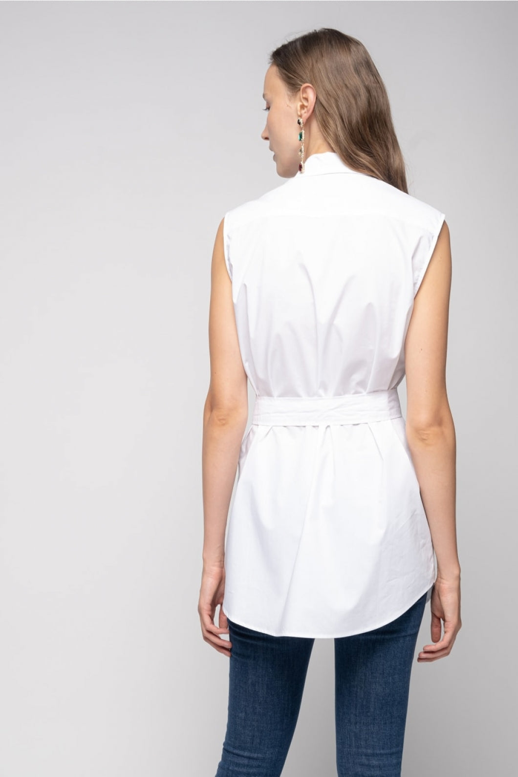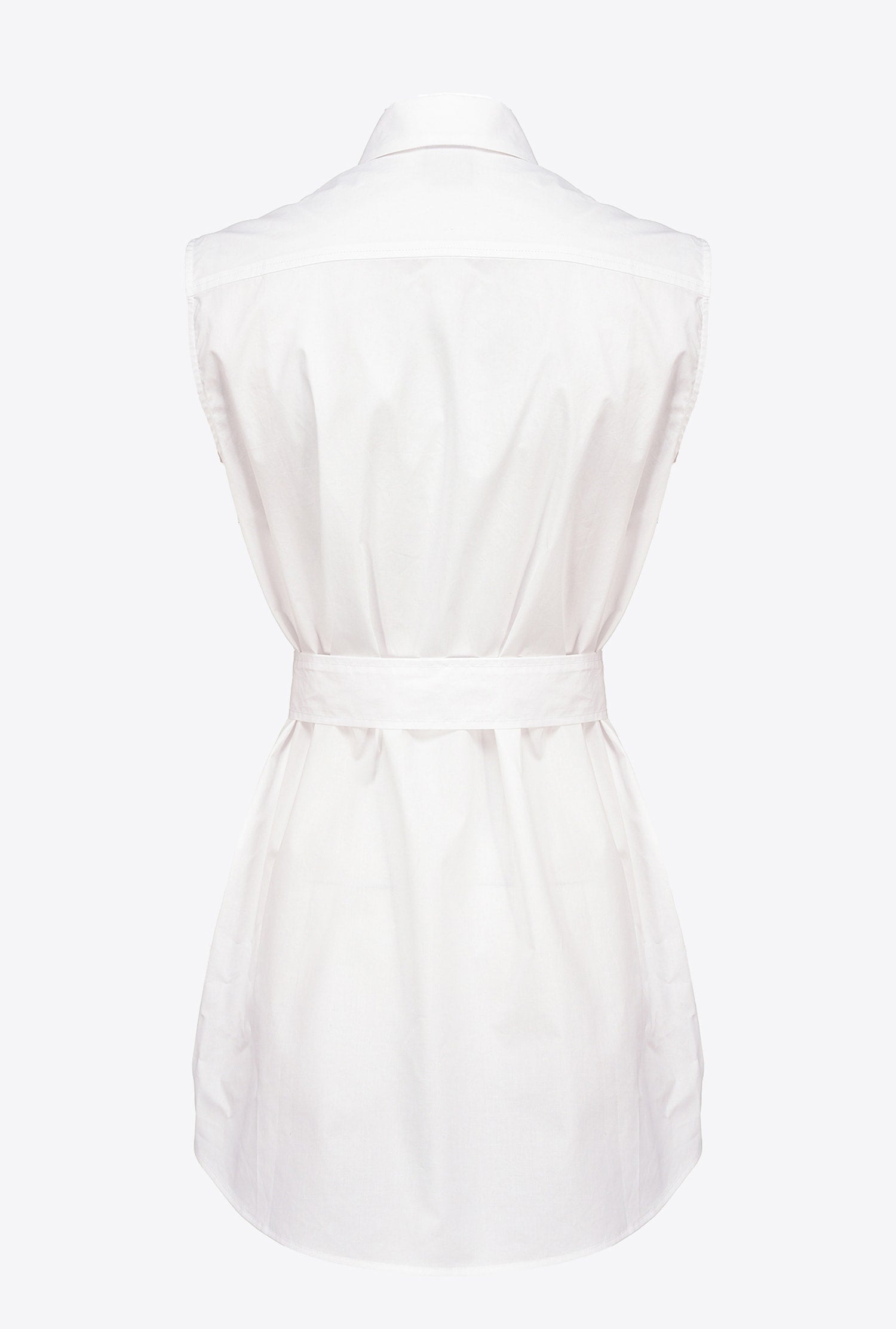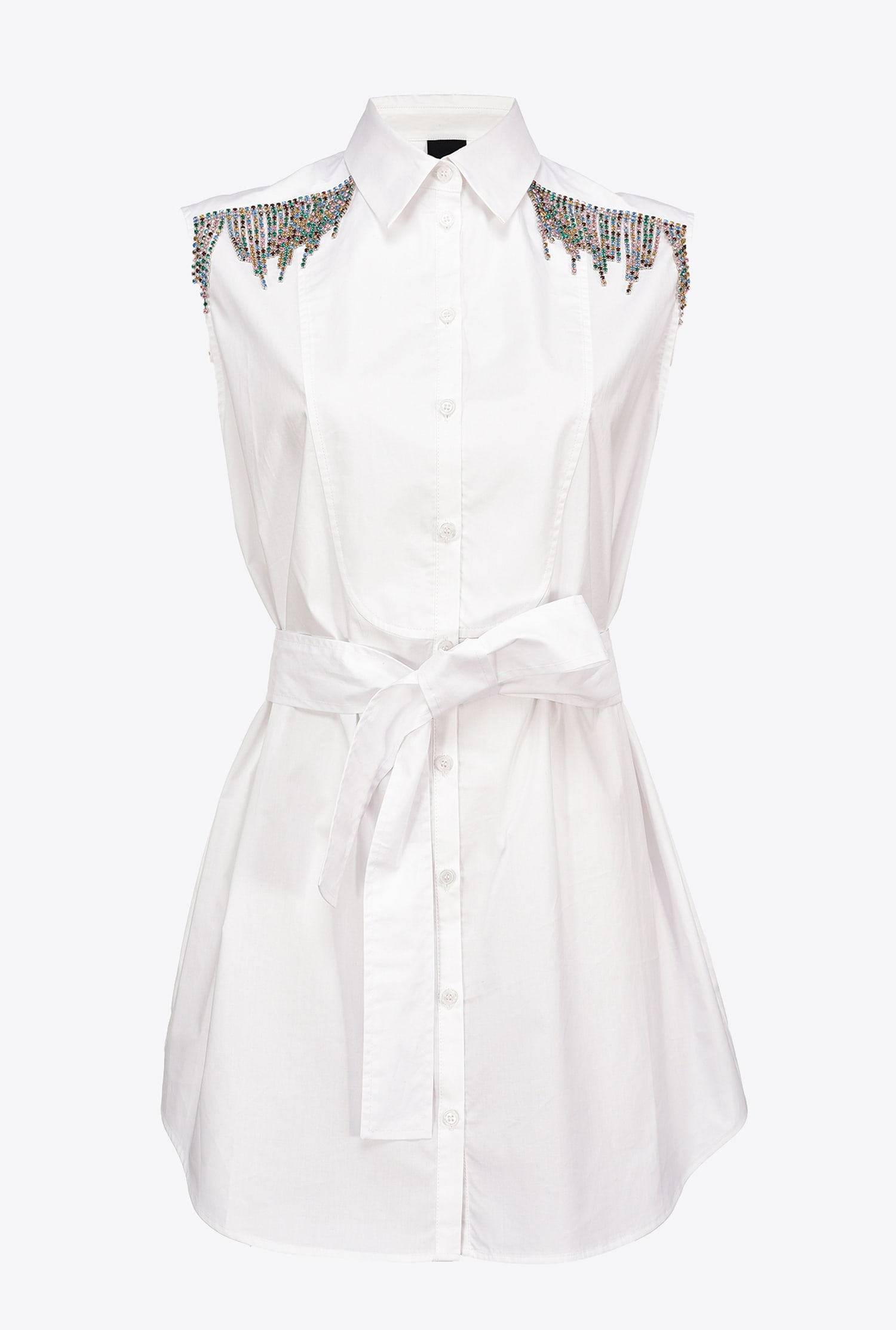 Pinko ärmelloses langes Hemd aus Popeline-Baumwolle, das sich durch mehrfarbige Strassfransen an den Schultern auszeichnet. Dazu passender Schärpengürtel aus demselben Stoff. Knopfverschluss vorne.